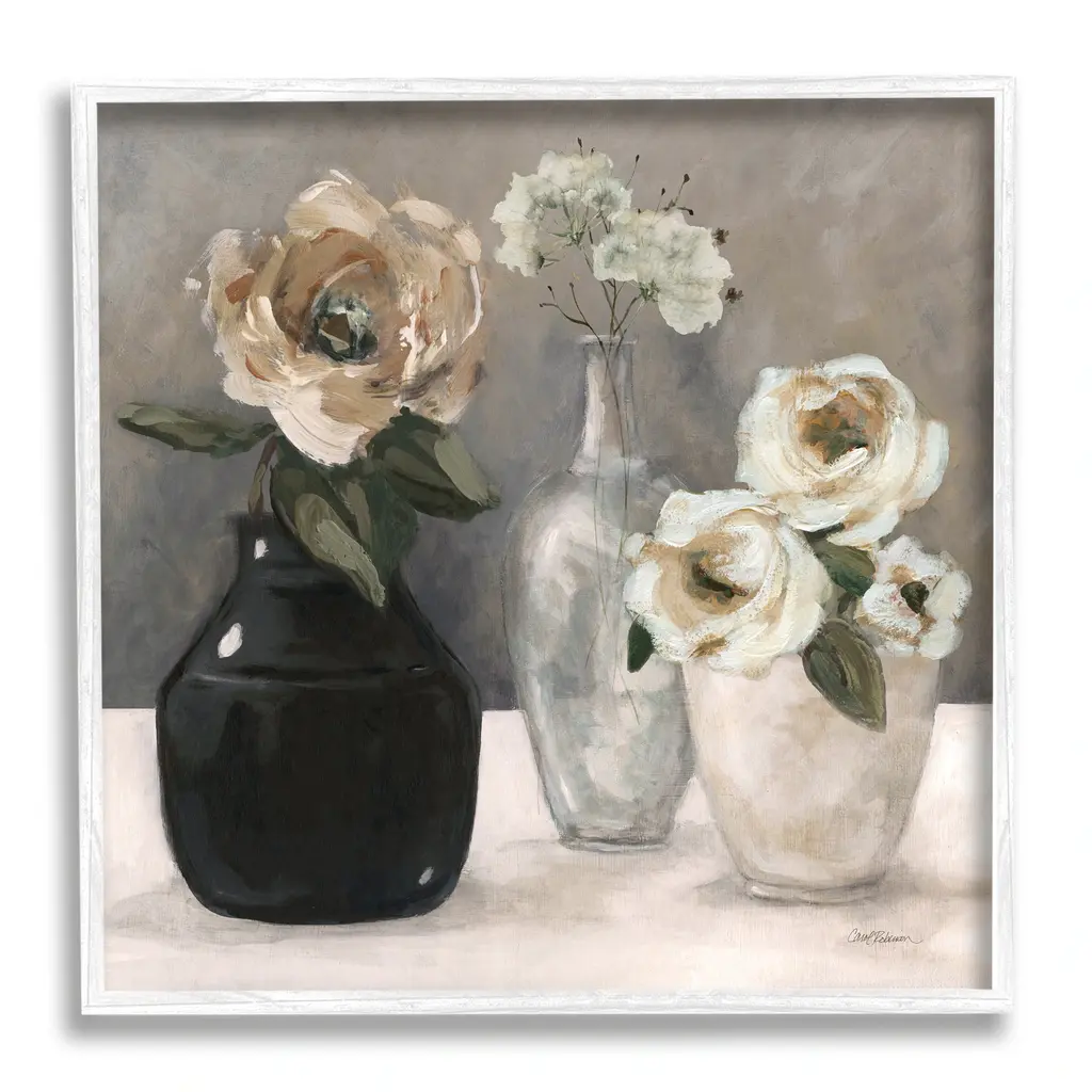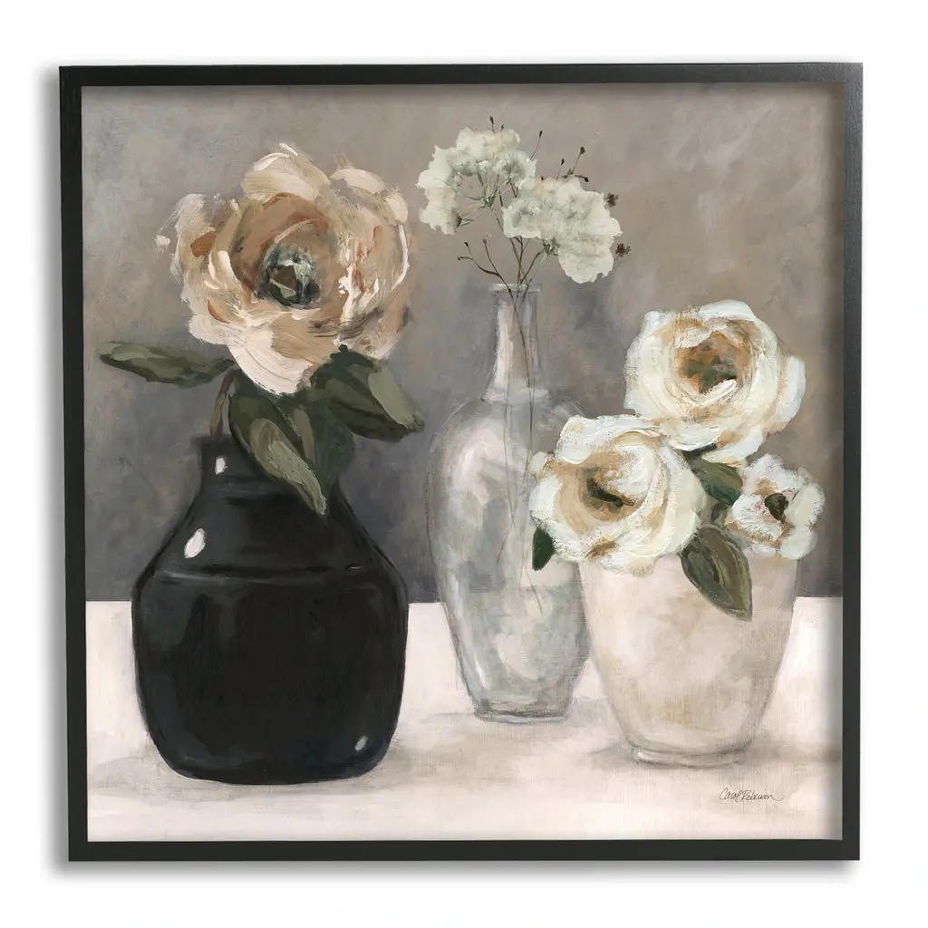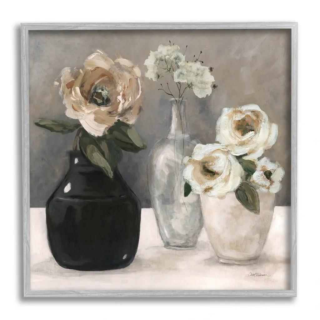 Add dimension to any room with our textured Framed Giclee Artwork. Our framed artwork is securely mounted into a 1.5-inch thick wood grain frame and ready to hang. Frames are available in three alluring styles: black, gray farmhouse and white. In addition, you should check out our oversized options if you want a statement piece. Stupell Wall Art is made in the USA.Features: Dimensions: 12 x 1.5 x 12 FramedFramed Giclee Sizes Include Standard: 12 x 1.5 x 12 Large: 17 x 1.5 x 17 Oversized: 24 x 1.5 x 24Wall Art is Ready to Hang - No Installation or Hardware Needed. For Easy Set Up Lean or Layer Artwork on Shelf or Against Wall.Our giclée prints are carefully mounted on a durable MDF backing, and then perfectly finished in a 1.5 inch thick woodgrain frame. Mounted frame colors include black, gray farmhouse and white. Made In USA.Artwork Relates To: Painting, Vase, Flower, Plant, Rose, Flower Arrangement, Floral, Flower Bouquet, PetalDesign by Carol Robinson