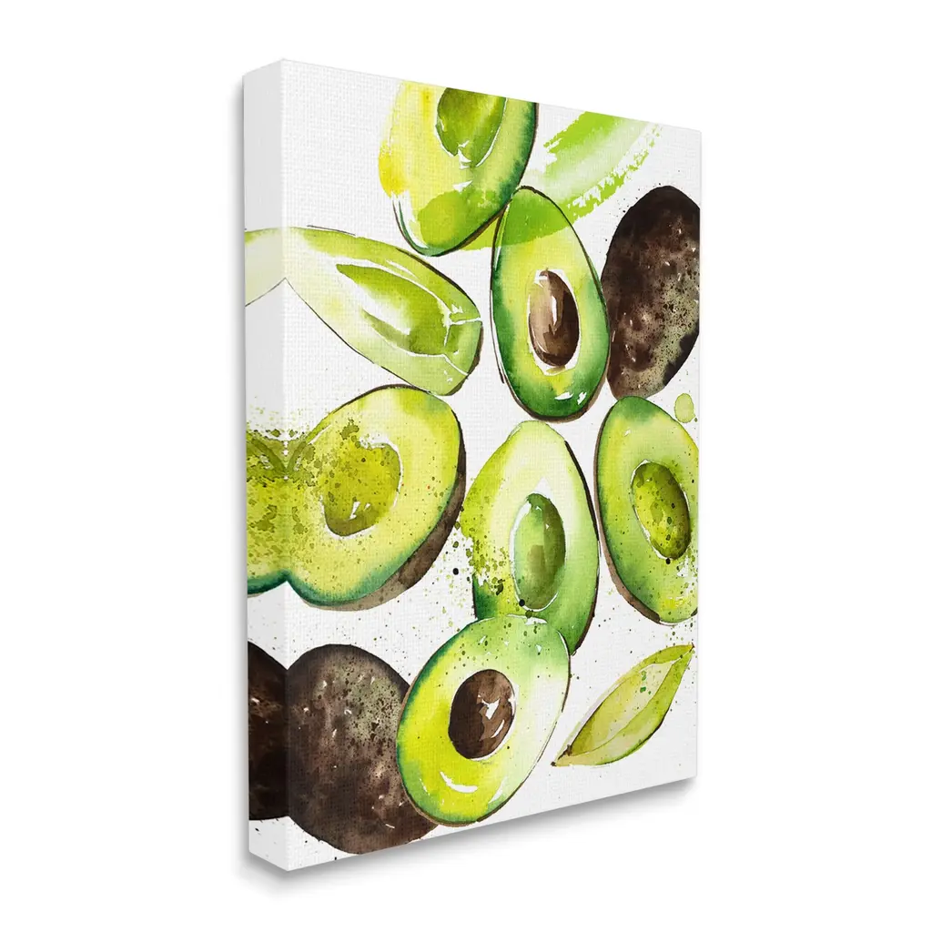 We create our stretched canvas to the highest standards. Using only the highest quality inks and canvas on Mimaki printers, we hand-cut and stretch each piece over a 1.5-inch thick wooden frame for hanging. As a result, the art comes ready to hang on the sturdy ledge with no installation required. Stupell Wall Art is made in the USA.Features: Dimensions: 16 x 1.5 x 20 InchesStretched Canvas Sizes Include Standard: 16 x 1.5 x 20 Large: 20 x 1.5 x 30 X-Large: 30 x 1.5 x 40 Oversized: 36 x 1.5 x 48Wall Art is Ready to Hang with Hardware Free Hanging. No installation required. For Easy Set Up Lean or Layer Artwork on Shelf or Against Wall.Our stretched canvas is created with the highest standards. We use only the highest quality inks and canvas on our in house Mimaki printers, and then hand cut and stretch each piece over a 1.5 inch thick wooden frame for hanging. Made In USA.Artwork Relates To: Food, Fruit, Plant, Produce, AvocadoDesign by Enya Todd