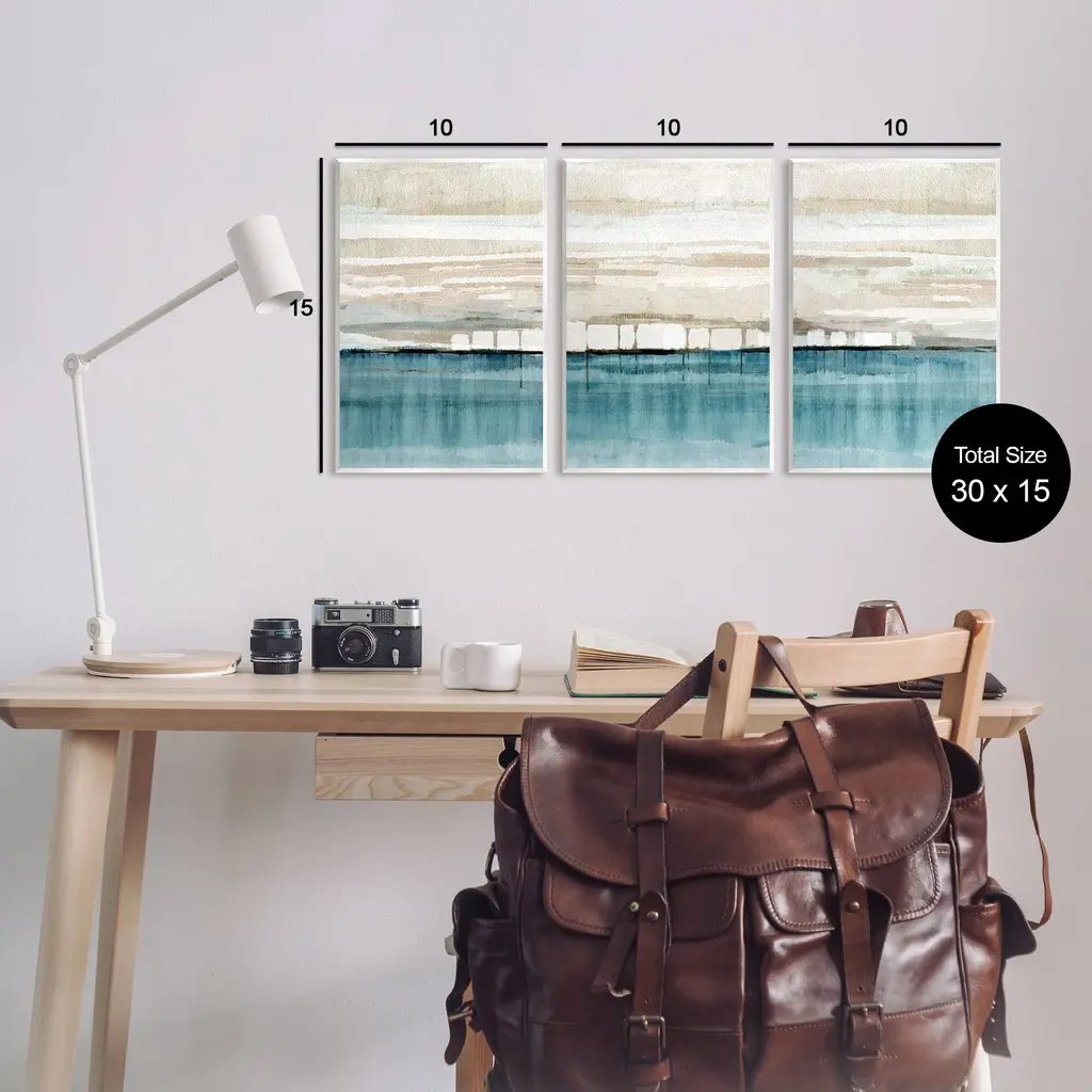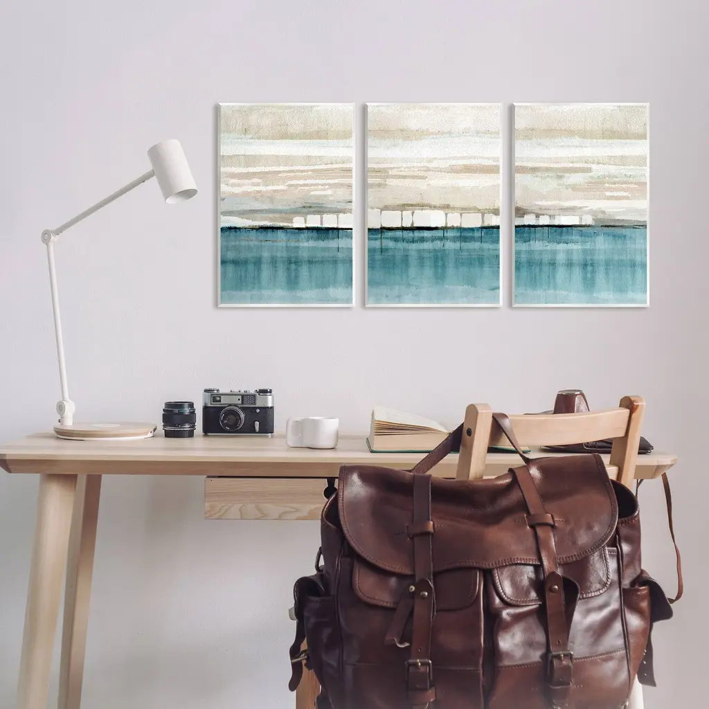Fill any space with Stupell Wall Art Sets. Our wall plaques start as high-quality lithograph prints mounted on durable 0.5-inch thick MDF wood. Each piece is hand finished and comes with a fresh layer of white foil on the sides to give it a crisp, clean look. Plaques arrive ready to hang without installation and come with removable plastic corners to keep them from damage in transit. Stupell Industries Wall Art is made in the USA.Features: Dimensions: 3 Piece Set, Each Panel is 10 x 0.5 x 15 InchesWall Plaque Set Sizes Include Standard: 3pc, Each is 10 x 0.5 x 15 Oversized: 3pc, Each is 13 x 0.5 x 19Wall Art is Ready to Hang with Hardware Free Hanging. No installation required. For Easy Set Up Lean or Layer Artwork on Shelf or Against Wall.All of our wall plaques start off as high quality lithograph prints that are then mounted on durable 0.5 inch thick MDF wood. Each piece is hand finished and comes with a fresh layer of foil on the sides to give it a crisp clean look. Made In USA.Artwork Relates To: Abstract, Modern, Landscape, Blue, BeigeDesign by Flora Kouta