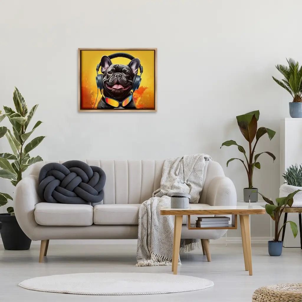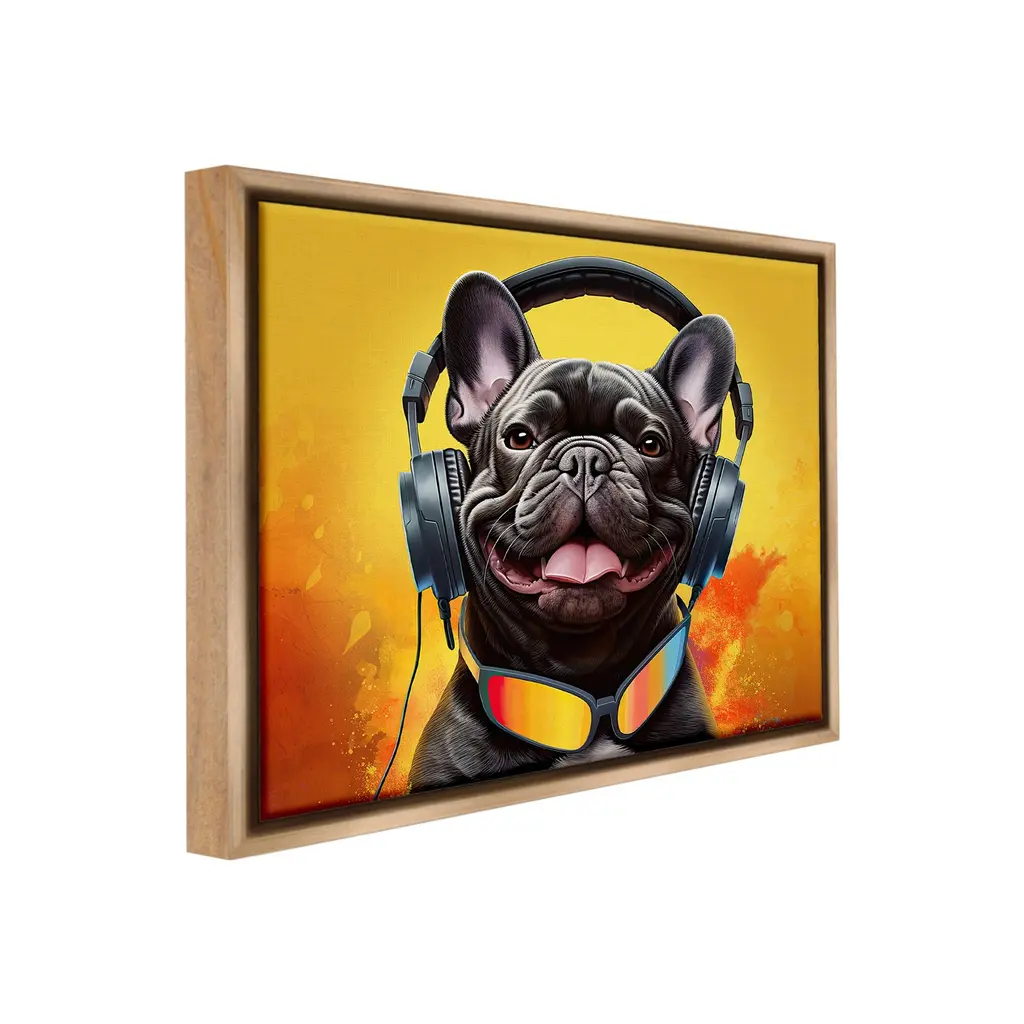 Elevate your home or office to the next level with Stupell Framed Floating Canvas Wall Art. Our premium hand-stretched canvas is mounted securely into a sturdy lightweight frame. The museum-style gap between the wrapped canvas and the box frame gives the illusion of floating artwork. Stupell Wall Art is made in the USA.Features: Dimensions: 21 x 1.7 x 17 Frame, 20 x 1.5 x 16 Canvas ArtFloating Frame Canvas Products are available in sizes 21"x17" and 31"x25". All Floating Frame Canvas Products have a 1.7" Depth.Wall Art is Ready to Hang with Hardware Free Hanging. No Installation required. For Easy Set Up Lean or Layer Artwork on Shelf or Against Wall. Artwork is Permently Fixed into the Frame.Our elevated 1.7" Thick Floating Frame is the perfect complement to our canvas style Wall Art. We use only the highest quality inks in house with industry leading printing solutions. Canvas is hand stretched over a durable wood foundation and then mounted securly into a Modern Box Frame. Made in the USA.Artwork Relates To: Animal, Canine, Dog, Mammal, Pet, Humor, Funny, Headphones, MusicDesign by Jim Baldwin