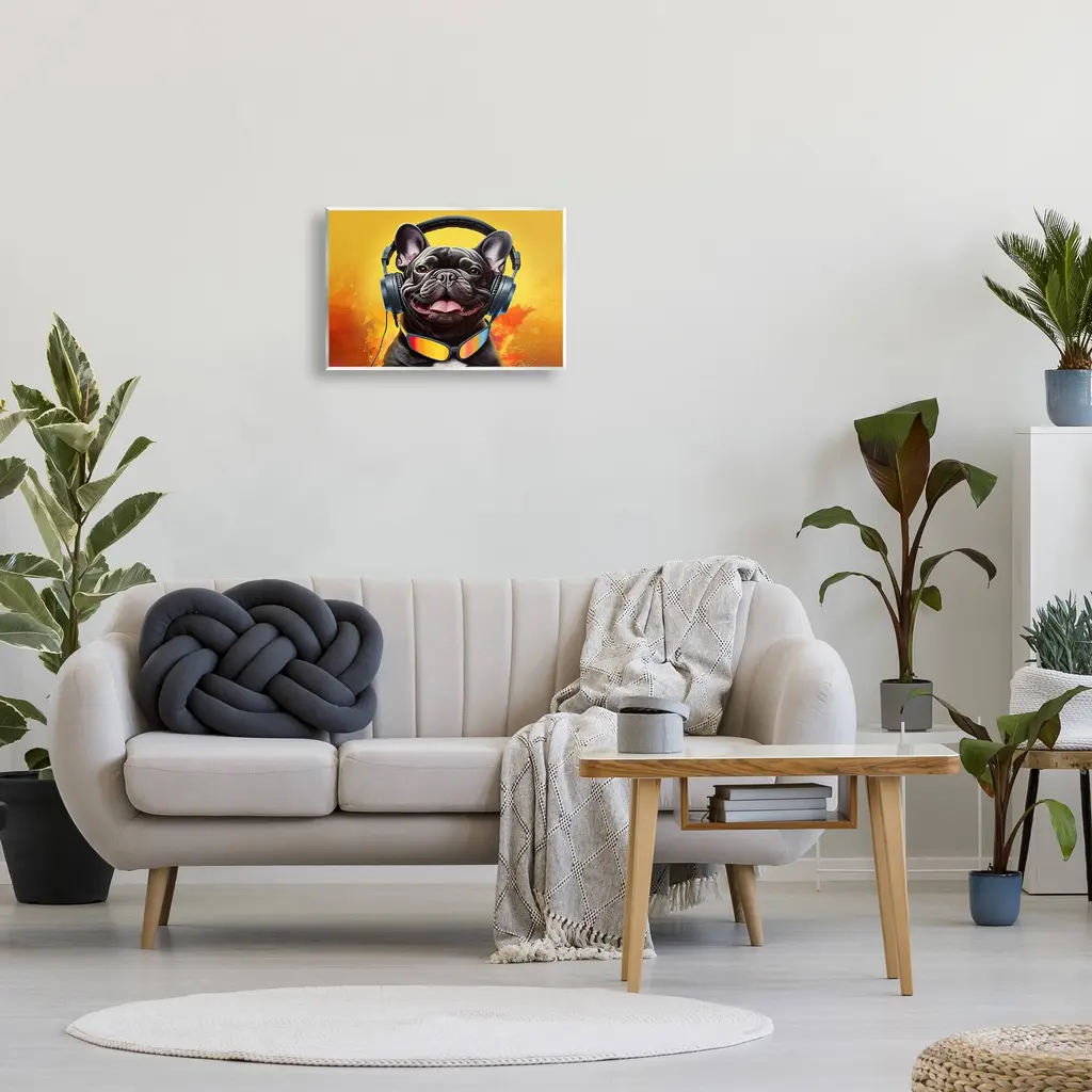 Our wall plaques start as high-quality lithograph prints mounted on durable 0.5-inch thick MDF wood. Each piece is hand finished and comes with a fresh layer of white foil on the sides to give it a crisp, clean look. Plaques arrive ready to hang without installation and come with removable plastic corners to keep them from damage in transit. Stupell Wall Art is made in the USA.Features: Dimensions: 15 x 0.5 x 10 InchesWall Plaque Product Sizes Include 15"x10" and 19"x13". All wall plaque products have a 0.5" Depth. Wall Art is Ready to Hang with Hardware Free Hanging. No installation required. For Easy Set Up Lean or Layer Artwork on Shelf or Against Wall.All of our wall plaques start off as high quality lithograph prints that are then mounted on durable 0.5 inch thick MDF wood. Each piece is hand finished and comes with a fresh layer of foil on the sides to give it a crisp clean look. Made In USA.Artwork Relates To: Animal, Canine, Dog, Mammal, Pet, Humor, Funny, Headphones, MusicDesign by Jim Baldwin