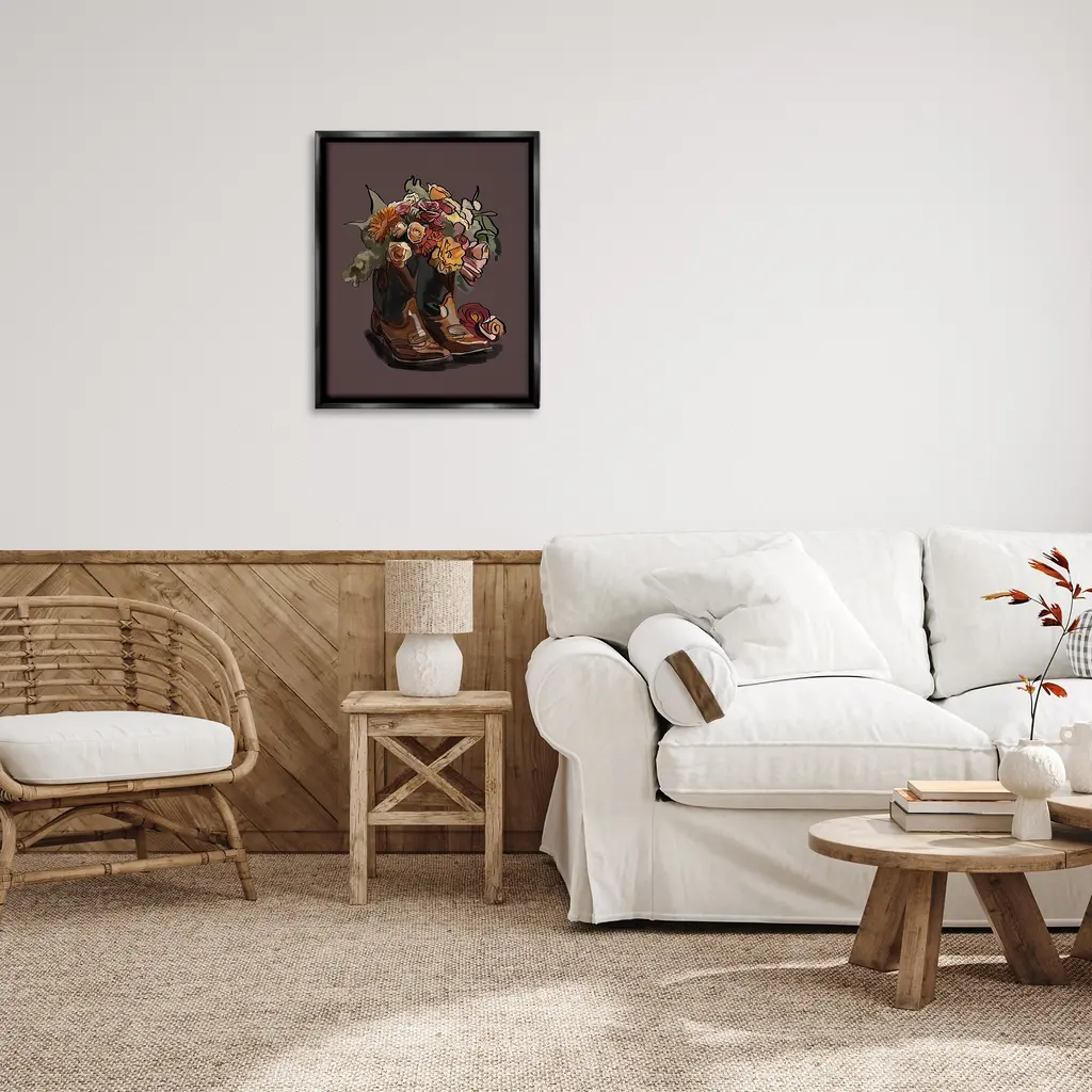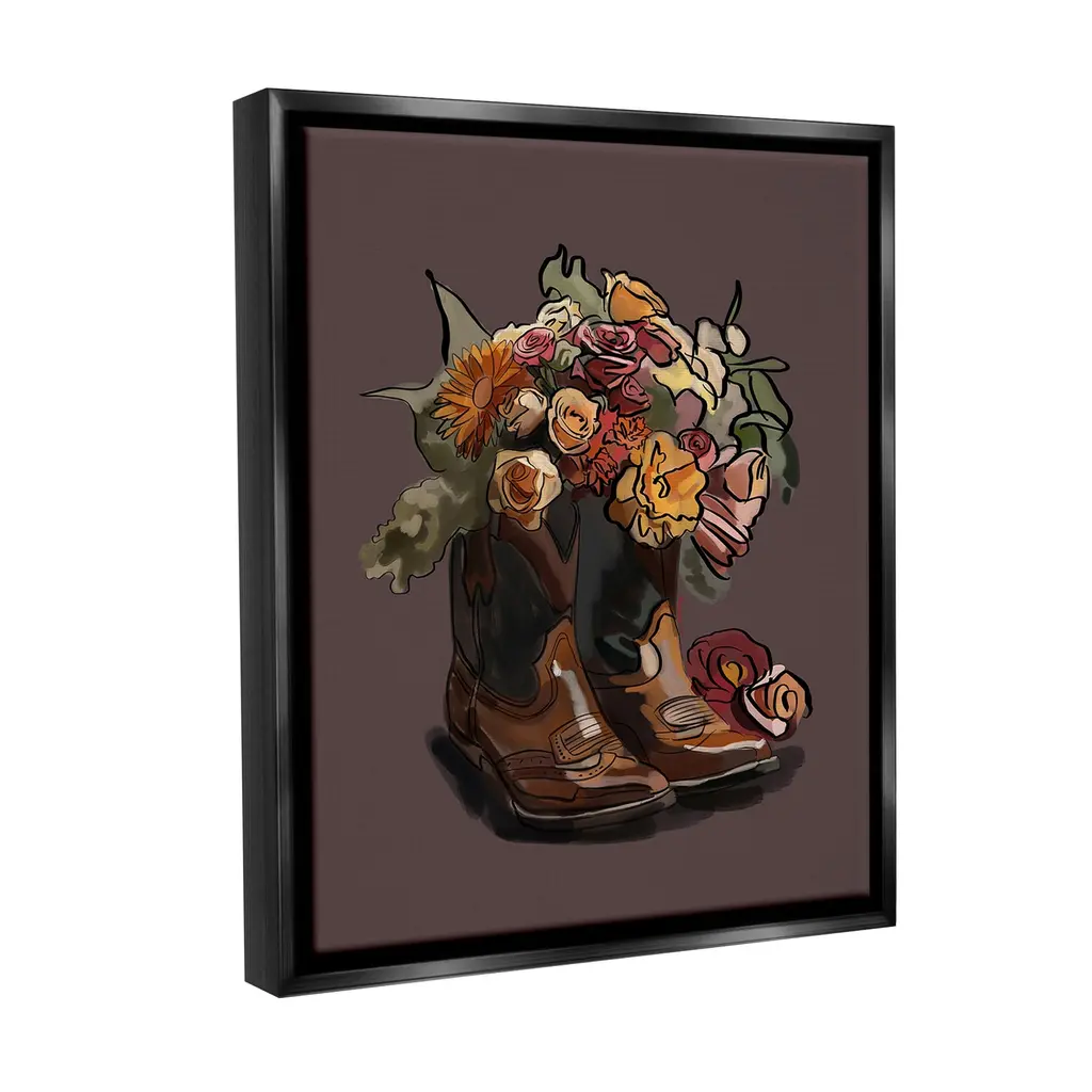 Elevate your home or office to the next level with Stupell Framed Floating Canvas Wall Art. Our premium hand-stretched canvas is mounted securely into a sturdy lightweight frame. The museum-style gap between the wrapped canvas and the box frame gives the illusion of floating artwork. Stupell Wall Art is made in the USA.Features: Dimensions: 17 x 1.7 x 21 Frame, 16 x 1.5 x 20 Canvas ArtFloating Frame Canvas Products are available in sizes 17"x21" and 25"x31". All Floating Frame Canvas Products have a 1.7" Depth.Wall Art is Ready to Hang with Hardware Free Hanging. No Installation required. For Easy Set Up Lean or Layer Artwork on Shelf or Against Wall. Artwork is Permently Fixed into the Frame.Our elevated 1.7" Thick Floating Frame is the perfect complement to our canvas style Wall Art. We use only the highest quality inks in house with industry leading printing solutions. Canvas is hand stretched over a durable wood foundation and then mounted securly into a Modern Box Frame. Made in the USA.Artwork Relates To: Equestrian, Rodeo, Country, Southwestern, Cowboy, Cowgirl, Cowboy Boot, Flower, Floral, BouquetDesign by Amelia Noyes