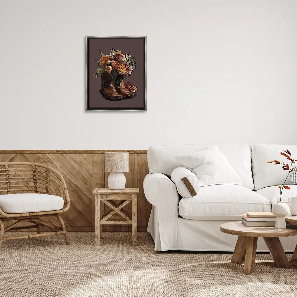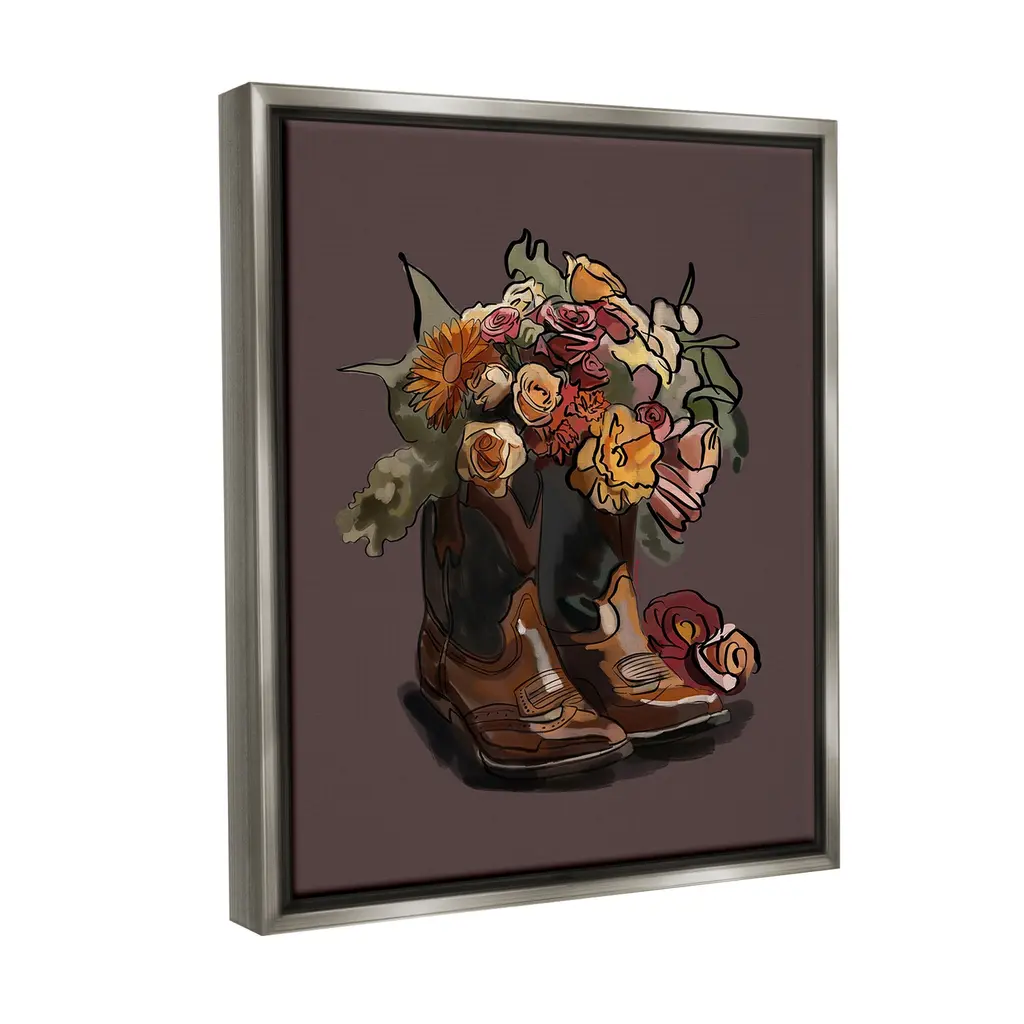 Elevate your home or office to the next level with Stupell Framed Floating Canvas Wall Art. Our premium hand-stretched canvas is mounted securely into a sturdy lightweight frame. The museum-style gap between the wrapped canvas and the box frame gives the illusion of floating artwork. Stupell Wall Art is made in the USA.Features: Dimensions: 17 x 1.7 x 21 Frame, 16 x 1.5 x 20 Canvas ArtFloating Frame Canvas Products are available in sizes 17"x21" and 25"x31". All Floating Frame Canvas Products have a 1.7" Depth.Wall Art is Ready to Hang with Hardware Free Hanging. No Installation required. For Easy Set Up Lean or Layer Artwork on Shelf or Against Wall. Artwork is Permently Fixed into the Frame.Our elevated 1.7" Thick Floating Frame is the perfect complement to our canvas style Wall Art. We use only the highest quality inks in house with industry leading printing solutions. Canvas is hand stretched over a durable wood foundation and then mounted securly into a Modern Box Frame. Made in the USA.Artwork Relates To: Equestrian, Rodeo, Country, Southwestern, Cowboy, Cowgirl, Cowboy Boot, Flower, Floral, BouquetDesign by Amelia Noyes