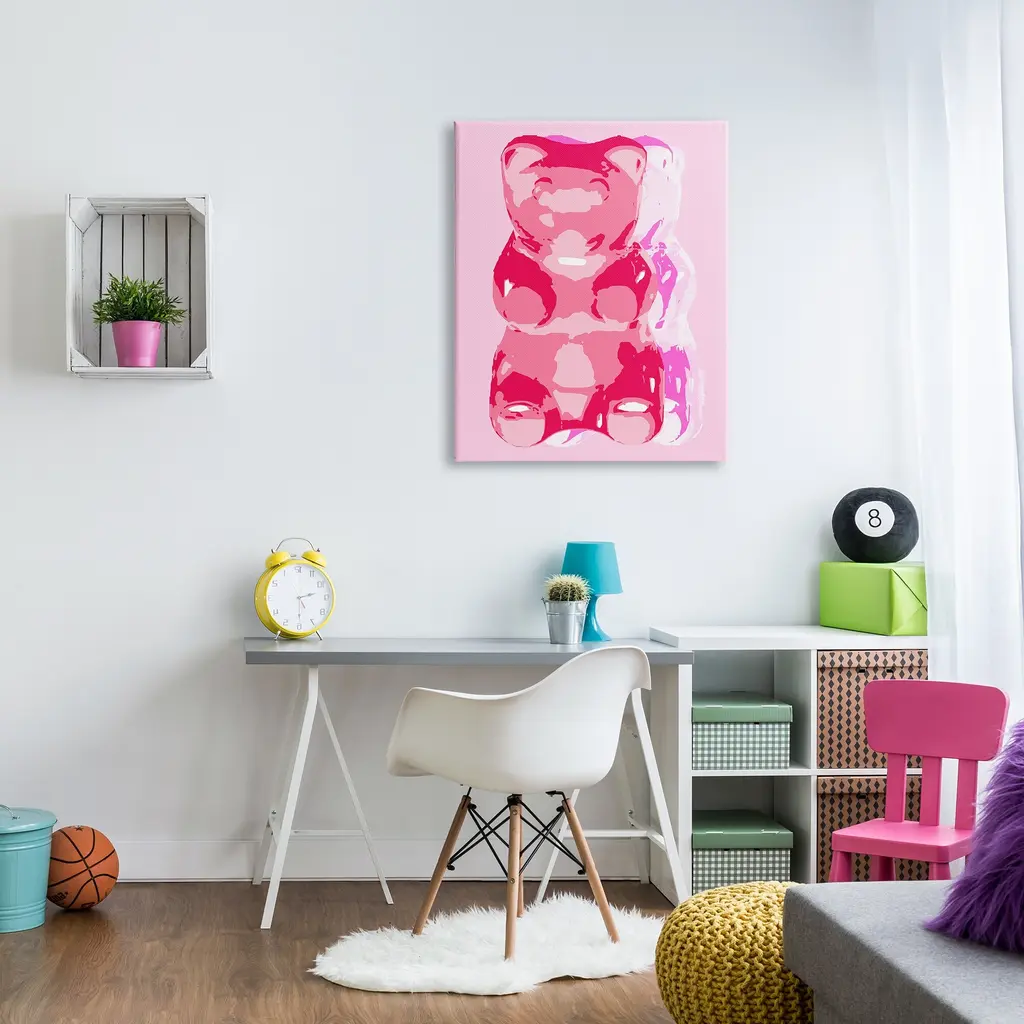 We create our stretched canvas to the highest standards. Using only the highest quality inks and canvas on Mimaki printers, we hand-cut and stretch each piece over a 1.5-inch thick wooden frame for hanging. As a result, the art comes ready to hang on the sturdy ledge with no installation required. Stupell Wall Art is made in the USA.Features: Dimensions: 16 x 1.5 x 20 InchesStretched Canvas Sizes Include Standard: 16 x 1.5 x 20 Large: 20 x 1.5 x 30 X-Large: 30 x 1.5 x 40 Oversized: 36 x 1.5 x 48Wall Art is Ready to Hang with Hardware Free Hanging. No installation required. For Easy Set Up Lean or Layer Artwork on Shelf or Against Wall.Our stretched canvas is created with the highest standards. We use only the highest quality inks and canvas on our in house Mimaki printers, and then hand cut and stretch each piece over a 1.5 inch thick wooden frame for hanging. Made In USA.Artwork Relates To: Food, Candy, Gummy Bear, PinkDesign by Lil' Rue