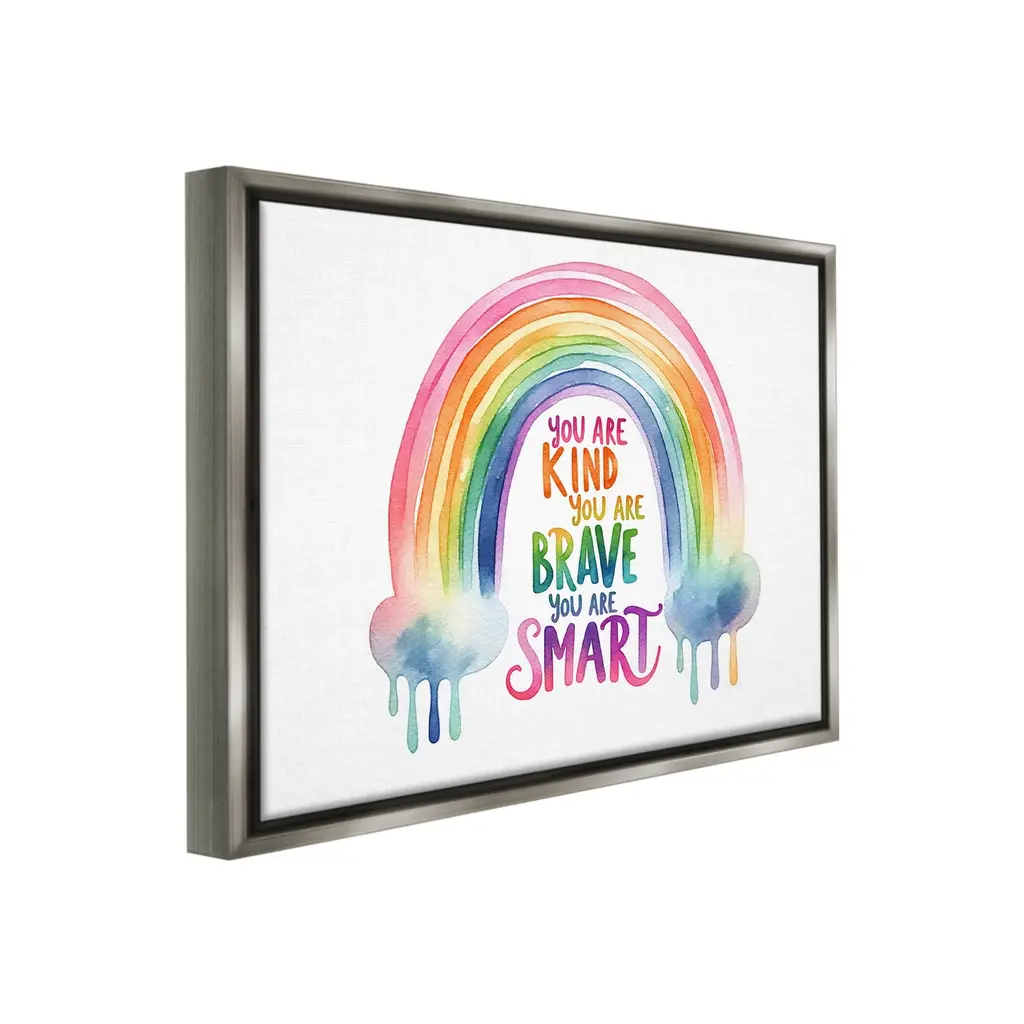 Elevate your home or office to the next level with Stupell Framed Floating Canvas Wall Art. Our premium hand-stretched canvas is mounted securely into a sturdy lightweight frame. The museum-style gap between the wrapped canvas and the box frame gives the illusion of floating artwork. Stupell Wall Art is made in the USA.Features: Dimensions: 21 x 1.7 x 17 Frame, 20 x 1.5 x 16 Canvas ArtFloating Frame Canvas Products are available in sizes 21"x17" and 31"x25". All Floating Frame Canvas Products have a 1.7" Depth.Wall Art is Ready to Hang with Hardware Free Hanging. No Installation required. For Easy Set Up Lean or Layer Artwork on Shelf or Against Wall. Artwork is Permently Fixed into the Frame.Our elevated 1.7" Thick Floating Frame is the perfect complement to our canvas style Wall Art. We use only the highest quality inks in house with industry leading printing solutions. Canvas is hand stretched over a durable wood foundation and then mounted securly into a Modern Box Frame. Made in the USA.Artwork Relates To: Landscape, Nature, Cloud, Rainbow, Inspirational, Phrase, Heart, You Are Kind, You Are Brave, You Are SmartDesign by Amanda Greenwood