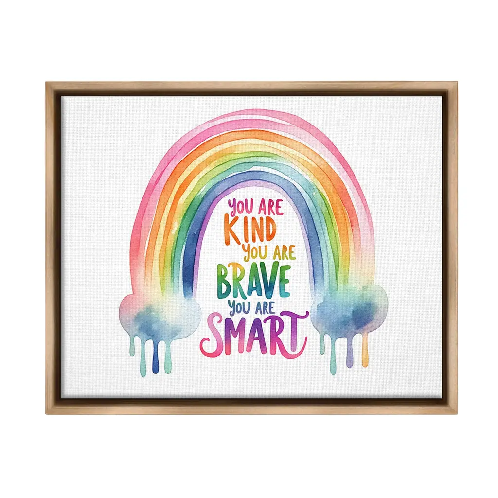 Elevate your home or office to the next level with Stupell Framed Floating Canvas Wall Art. Our premium hand-stretched canvas is mounted securely into a sturdy lightweight frame. The museum-style gap between the wrapped canvas and the box frame gives the illusion of floating artwork. Stupell Wall Art is made in the USA.Features: Dimensions: 21 x 1.7 x 17 Frame, 20 x 1.5 x 16 Canvas ArtFloating Frame Canvas Products are available in sizes 21"x17" and 31"x25". All Floating Frame Canvas Products have a 1.7" Depth.Wall Art is Ready to Hang with Hardware Free Hanging. No Installation required. For Easy Set Up Lean or Layer Artwork on Shelf or Against Wall. Artwork is Permently Fixed into the Frame.Our elevated 1.7" Thick Floating Frame is the perfect complement to our canvas style Wall Art. We use only the highest quality inks in house with industry leading printing solutions. Canvas is hand stretched over a durable wood foundation and then mounted securly into a Modern Box Frame. Made in the USA.Artwork Relates To: Landscape, Nature, Cloud, Rainbow, Inspirational, Phrase, Heart, You Are Kind, You Are Brave, You Are SmartDesign by Amanda Greenwood