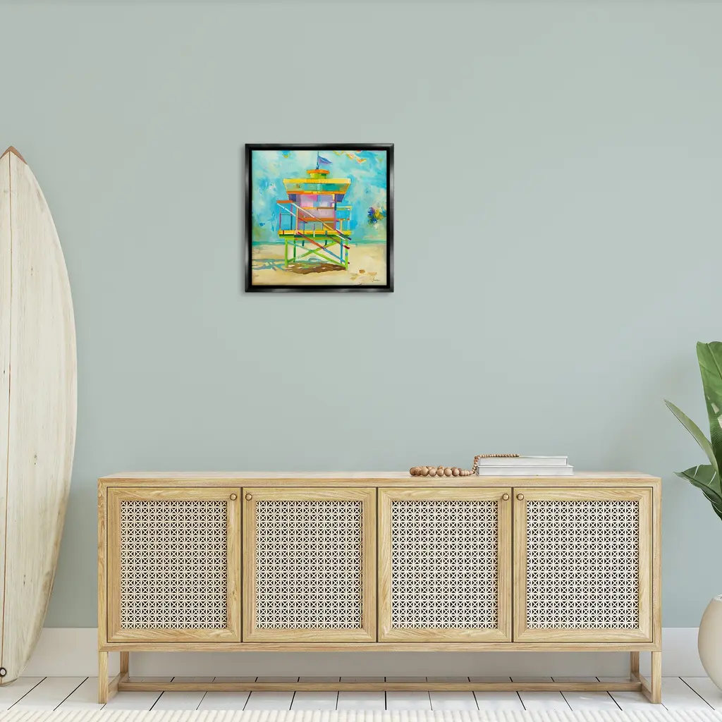 Elevate your home or office to the next level with Stupell Framed Floating Canvas Wall Art. Our premium hand-stretched canvas is mounted securely into a sturdy lightweight frame. The museum-style gap between the wrapped canvas and the box frame gives the illusion of floating artwork. Stupell Wall Art is made in the USA.Features: Dimensions: 18 x 1.7 x 18 Frame, 17 x 1.5 x 17 Canvas ArtFloating Frame Canvas Products are available in sizes 18"x18" and 25"x25". All Floating Frame Canvas Products have a 1.7" Depth.Wall Art is Ready to Hang with Hardware Free Hanging. No Installation required. For Easy Set Up Lean or Layer Artwork on Shelf or Against Wall. Artwork is Permently Fixed into the Frame.Our elevated 1.7" Thick Floating Frame is the perfect complement to our canvas style Wall Art. We use only the highest quality inks in house with industry leading printing solutions. Canvas is hand stretched over a durable wood foundation and then mounted securly into a Modern Box Frame. Made in the USA.Artwork Relates To: Modern, Painting, Beach, Nautical, Summer, Tropical, Lifeguard Hut, Seagull, Bird, AbstractDesign by Liz Jardine