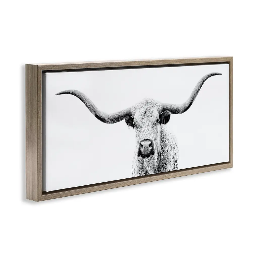 Elevate your home or office to the next level with Stupell Framed Floating Canvas Wall Art. Our premium hand-stretched canvas is mounted securely into a sturdy lightweight frame. The museum-style gap between the wrapped canvas and the box frame gives the illusion of floating artwork. Stupell Wall Art is made in the USA.Features: Dimensions: 25 x 1.7 x 11 Frame, 24 x 1.5 x 10 Canvas ArtFloating Frame Canvas Products are available in sizes 25"x11" and 31"x14". All Floating Frame Canvas Products have a 1.7" Depth.Wall Art is Ready to Hang with Hardware Free Hanging. No Installation required. For Easy Set Up Lean or Layer Artwork on Shelf or Against Wall. Artwork is Permently Fixed into the Frame.Our elevated 1.7" Thick Floating Frame is the perfect complement to our canvas style Wall Art. We use only the highest quality inks in house with industry leading printing solutions. Canvas is hand stretched over a durable wood foundation and then mounted securly into a Modern Box Frame. Made in the USA.Artwork Relates To: Longhorn, Cattle, Animal, Mammal, Wildlife, Farm, Country, SouthwesternDesign by PHBurchett