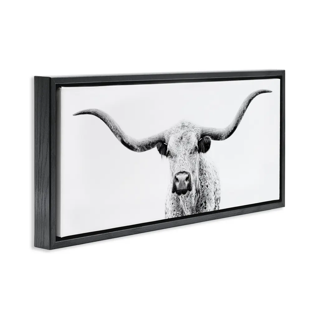 Elevate your home or office to the next level with Stupell Framed Floating Canvas Wall Art. Our premium hand-stretched canvas is mounted securely into a sturdy lightweight frame. The museum-style gap between the wrapped canvas and the box frame gives the illusion of floating artwork. Stupell Wall Art is made in the USA.Features: Dimensions: 25 x 1.7 x 11 Frame, 24 x 1.5 x 10 Canvas ArtFloating Frame Canvas Products are available in sizes 25"x11" and 31"x14". All Floating Frame Canvas Products have a 1.7" Depth.Wall Art is Ready to Hang with Hardware Free Hanging. No Installation required. For Easy Set Up Lean or Layer Artwork on Shelf or Against Wall. Artwork is Permently Fixed into the Frame.Our elevated 1.7" Thick Floating Frame is the perfect complement to our canvas style Wall Art. We use only the highest quality inks in house with industry leading printing solutions. Canvas is hand stretched over a durable wood foundation and then mounted securly into a Modern Box Frame. Made in the USA.Artwork Relates To: Longhorn, Cattle, Animal, Mammal, Wildlife, Farm, Country, SouthwesternDesign by PHBurchett