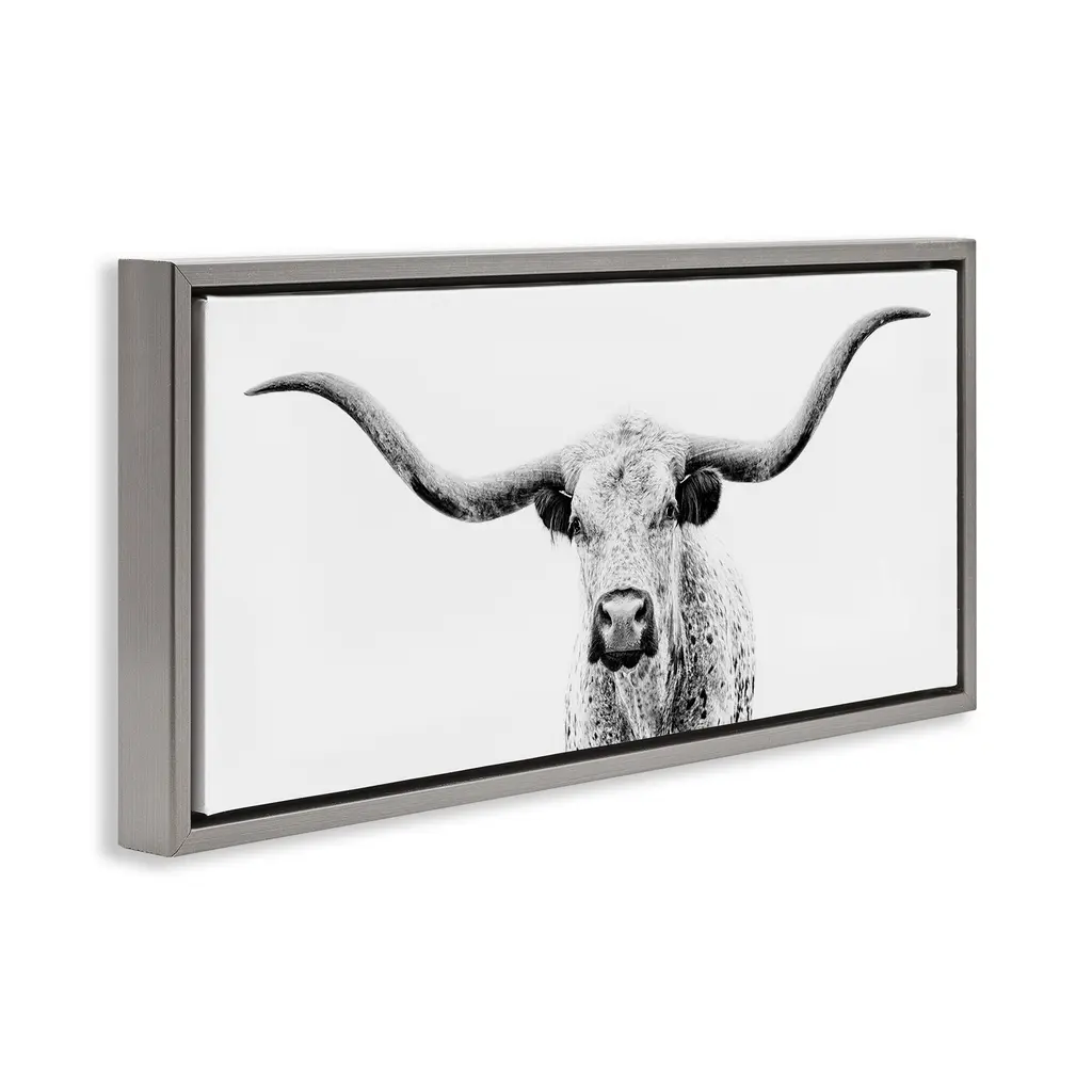 Elevate your home or office to the next level with Stupell Framed Floating Canvas Wall Art. Our premium hand-stretched canvas is mounted securely into a sturdy lightweight frame. The museum-style gap between the wrapped canvas and the box frame gives the illusion of floating artwork. Stupell Wall Art is made in the USA.Features: Dimensions: 25 x 1.7 x 11 Frame, 24 x 1.5 x 10 Canvas ArtFloating Frame Canvas Products are available in sizes 25"x11" and 31"x14". All Floating Frame Canvas Products have a 1.7" Depth.Wall Art is Ready to Hang with Hardware Free Hanging. No Installation required. For Easy Set Up Lean or Layer Artwork on Shelf or Against Wall. Artwork is Permently Fixed into the Frame.Our elevated 1.7" Thick Floating Frame is the perfect complement to our canvas style Wall Art. We use only the highest quality inks in house with industry leading printing solutions. Canvas is hand stretched over a durable wood foundation and then mounted securly into a Modern Box Frame. Made in the USA.Artwork Relates To: Longhorn, Cattle, Animal, Mammal, Wildlife, Farm, Country, SouthwesternDesign by PHBurchett