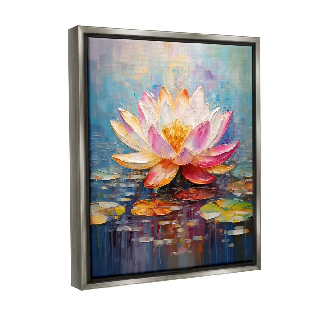 Elevate your home or office to the next level with Stupell Framed Floating Canvas Wall Art. Our premium hand-stretched canvas is mounted securely into a sturdy lightweight frame. The museum-style gap between the wrapped canvas and the box frame gives the illusion of floating artwork. Stupell Wall Art is made in the USA.Features: Dimensions: 17 x 1.7 x 21 Frame, 16 x 1.5 x 20 Canvas ArtFloating Frame Canvas Products are available in sizes 17"x21" and 25"x31". All Floating Frame Canvas Products have a 1.7" Depth.Wall Art is Ready to Hang with Hardware Free Hanging. No Installation required. For Easy Set Up Lean or Layer Artwork on Shelf or Against Wall. Artwork is Permently Fixed into the Frame.Our elevated 1.7" Thick Floating Frame is the perfect complement to our canvas style Wall Art. We use only the highest quality inks in house with industry leading printing solutions. Canvas is hand stretched over a durable wood foundation and then mounted securly into a Modern Box Frame. Made in the USA.Artwork Relates To: Flower, Plant, Petal, Painting, Lily, Pond Lily, Modern, LotusDesign by Gina Kelly