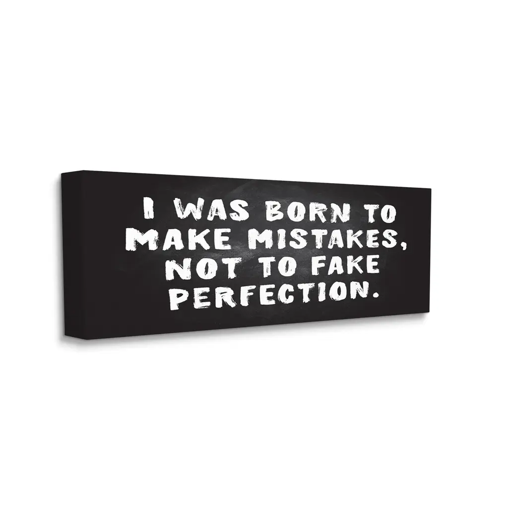 We create our stretched canvas to the highest standards. Using only the highest quality inks and canvas on Mimaki printers, we hand-cut and stretch each piece over a 1.5-inch thick wooden frame for hanging. As a result, the art comes ready to hang on the sturdy ledge with no installation required. Stupell Wall Art is made in the USA.Features: Dimensions: 24 x 1.5 x 10 InchesStretched Canvas Sizes Include Standard: 24 x 1.5 x 10 Large: 30 x 1.5 x 13 X-Large: 40 x 1.5 x 17 Oversized: 48 x 1.5 x 20Wall Art is Ready to Hang with Hardware Free Hanging. No installation required. For Easy Set Up Lean or Layer Artwork on Shelf or Against Wall.Our stretched canvas is created with the highest standards. We use only the highest quality inks and canvas on our in house Mimaki printers, and then hand cut and stretch each piece over a 1.5 inch thick wooden frame for hanging. Made In USA.Artwork Relates To: Phrase, Black, Modern, Motivational, I Was Born to Make Mistakes, Not to Fake PerfectionDesign by JJ Design House LLC