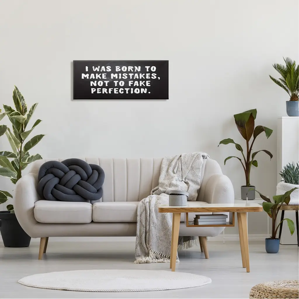We create our stretched canvas to the highest standards. Using only the highest quality inks and canvas on Mimaki printers, we hand-cut and stretch each piece over a 1.5-inch thick wooden frame for hanging. As a result, the art comes ready to hang on the sturdy ledge with no installation required. Stupell Wall Art is made in the USA.Features: Dimensions: 24 x 1.5 x 10 InchesStretched Canvas Sizes Include Standard: 24 x 1.5 x 10 Large: 30 x 1.5 x 13 X-Large: 40 x 1.5 x 17 Oversized: 48 x 1.5 x 20Wall Art is Ready to Hang with Hardware Free Hanging. No installation required. For Easy Set Up Lean or Layer Artwork on Shelf or Against Wall.Our stretched canvas is created with the highest standards. We use only the highest quality inks and canvas on our in house Mimaki printers, and then hand cut and stretch each piece over a 1.5 inch thick wooden frame for hanging. Made In USA.Artwork Relates To: Phrase, Black, Modern, Motivational, I Was Born to Make Mistakes, Not to Fake PerfectionDesign by JJ Design House LLC