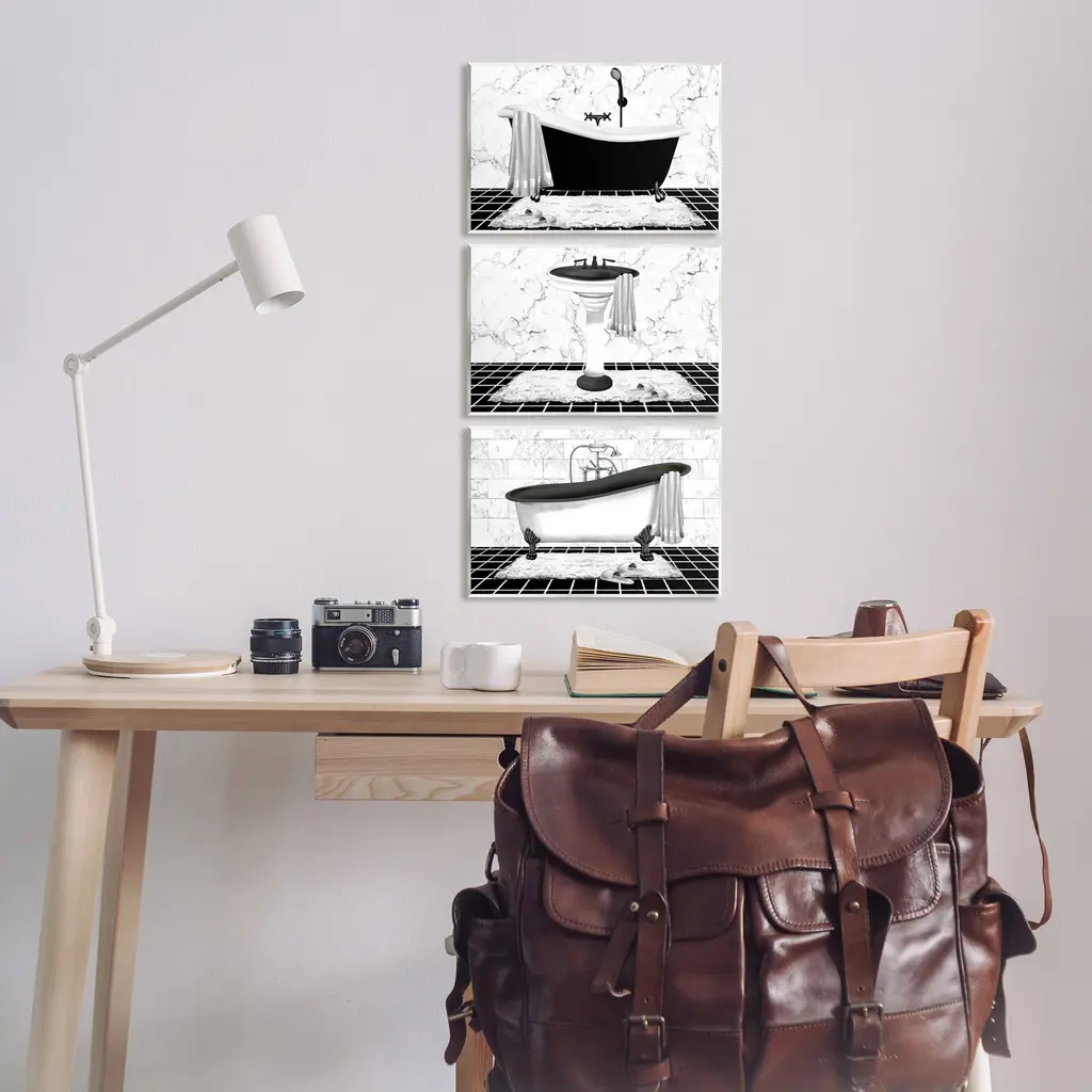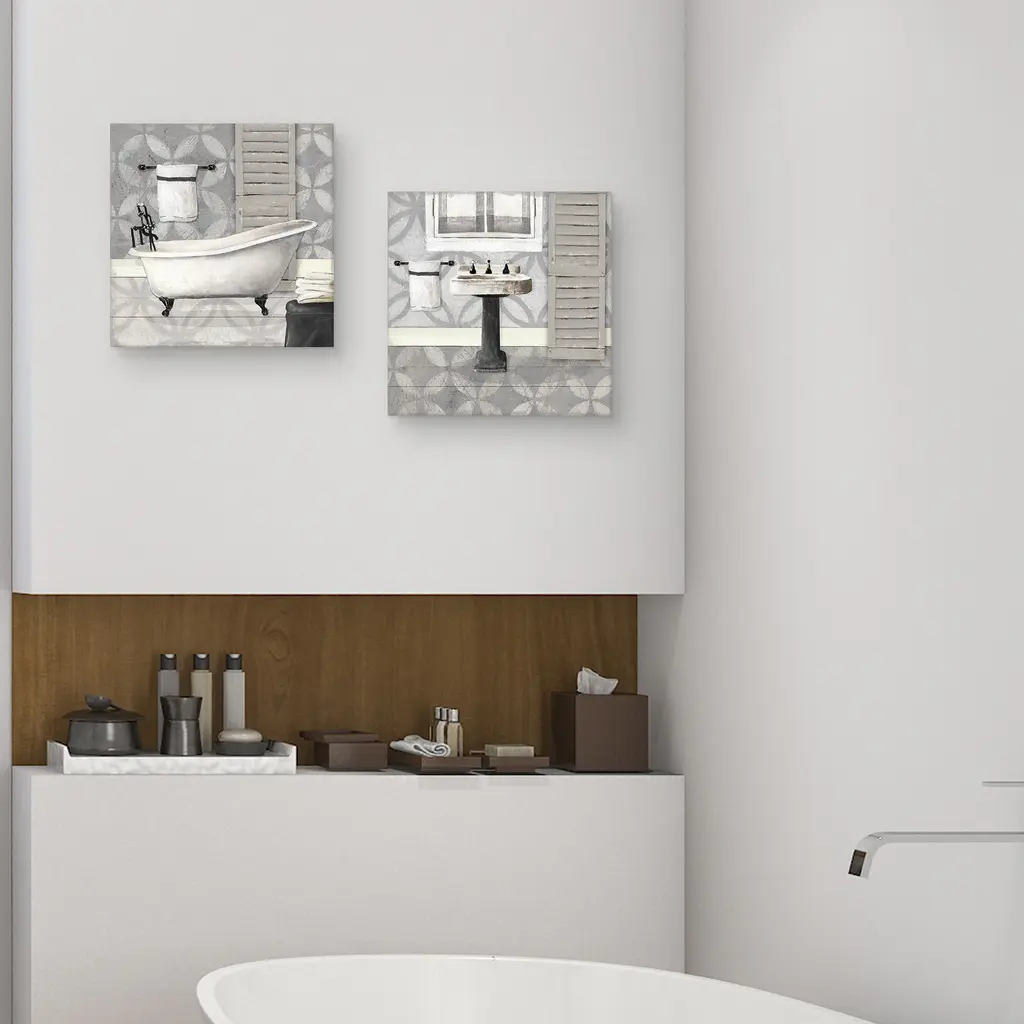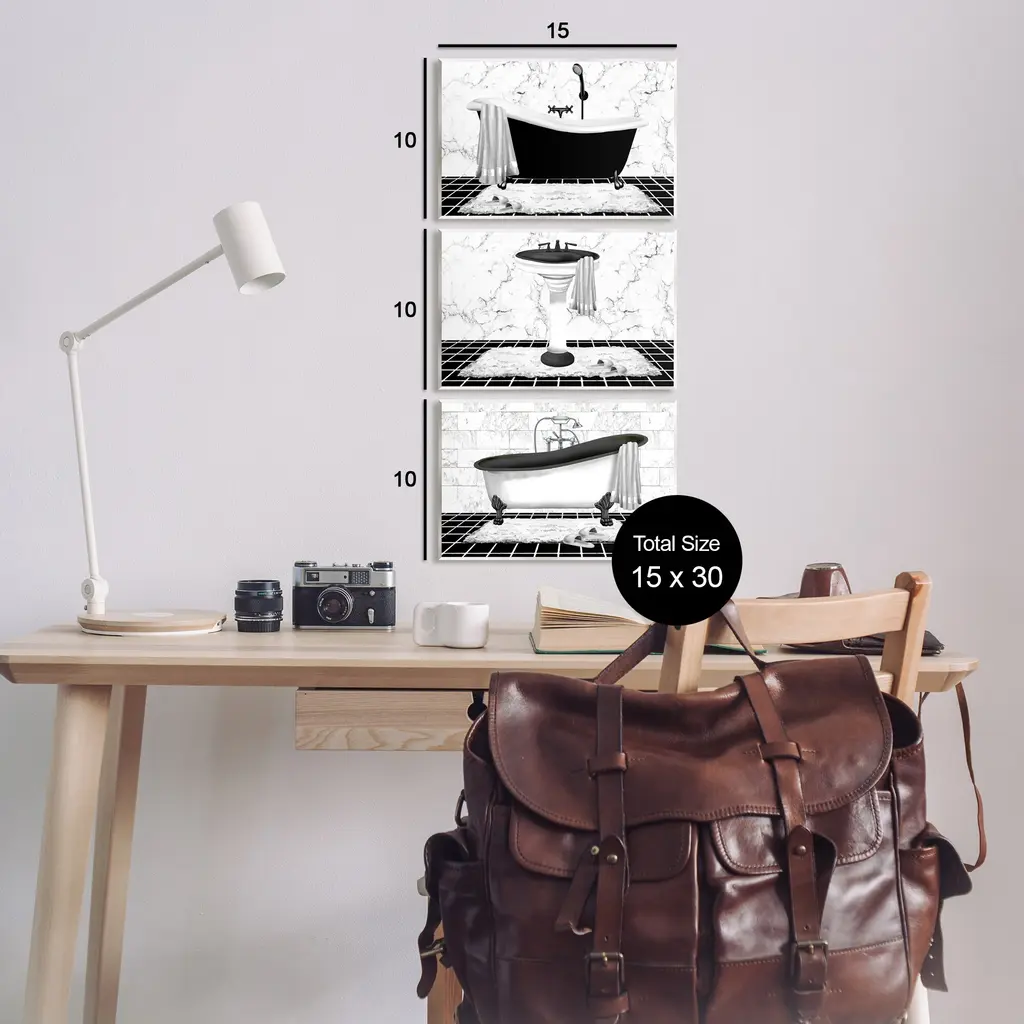 Fill any space with Stupell Wall Art Sets. Our wall plaques start as high-quality lithograph prints mounted on durable 0.5-inch thick MDF wood. Each piece is hand finished and comes with a fresh layer of white foil on the sides to give it a crisp, clean look. Plaques arrive ready to hang without installation and come with removable plastic corners to keep them from damage in transit. Wall Art is made in the USA.Features: Dimensions: 3 Piece Set, Each Panel is 15 x 0.5 x 10 InchesWooden Plaque Set Sizes Include Standard: 3pc, Each is 15 x 0.5 x 10 Oversized: 3pc, Each is 19 x 0.5 x 13Wall Art is Ready to Hang with Hardware Free Hanging. No installation required. For Easy Set Up Lean or Layer Artwork on Shelf or Against Wall.All of our wall plaques start off as high quality lithograph prints that are then mounted on durable 0.5 inch thick MDF wood. Each piece is hand finished and comes with a fresh layer of foil on the sides to give it a crisp clean look. Made In USA.Artwork Relates To: Bathtub, Bathroom, Modern, Marble, PatternDesign by Conrad Knutsen