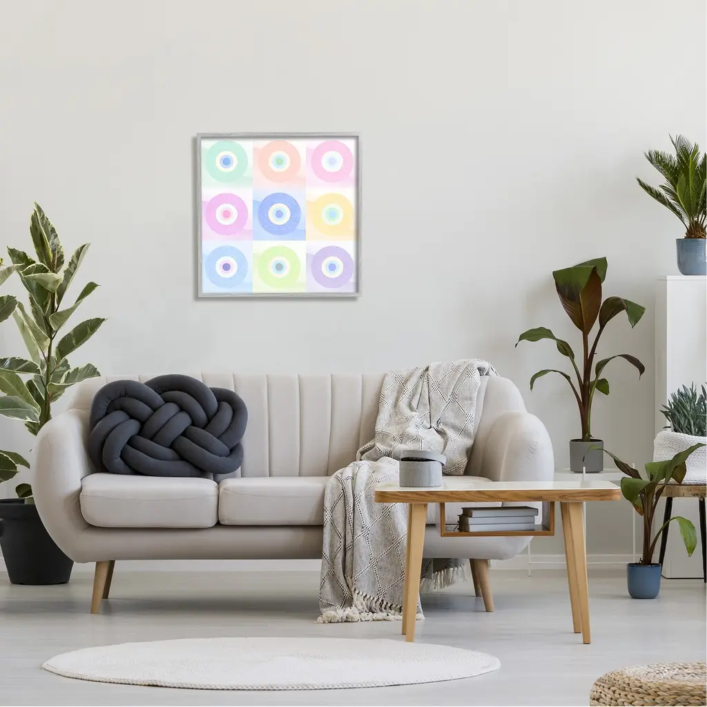 Add dimension to any room with our textured Framed Giclee Artwork. Our framed artwork is securely mounted into a 1.5-inch thick wood grain frame and ready to hang. Frames are available in three alluring styles: black, gray farmhouse and white. In addition, you should check out our oversized options if you want a statement piece. Stupell Wall Art is made in the USA.Features: Dimensions: 12 x 1.5 x 12 FramedFramed Giclee Sizes Include Standard: 12 x 1.5 x 12 Large: 17 x 1.5 x 17 Oversized: 24 x 1.5 x 24Wall Art is Ready to Hang with Hardware Free Hanging. No installation required. For Easy Set Up Lean or Layer Artwork on Shelf or Against Wall.Our giclée prints are carefully mounted on a durable MDF backing, and then perfectly finished in a 1.5 inch thick woodgrain frame. Mounted frame colors include black, gray farmhouse and white. Made In USA.Artwork Relates To: Modern, Contemporary, Abstract, Geometric, Pastel, Circles, Pop StyleDesign by Lil' Rue
