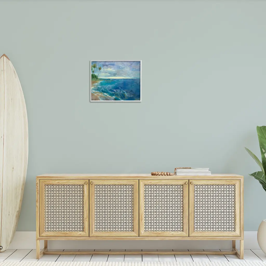 Add dimension to any room with our textured Framed Giclee Artwork. Our framed artwork is securely mounted into a 1.5-inch thick wood grain frame and ready to hang. Frames are available in three alluring styles: black, gray farmhouse and white. In addition, you should check out our oversized options if you want a statement piece. Stupell Wall Art is made in the USA.Features: Dimensions: 14 x 1.5 x 11 FramedFramed Giclee Products are available in the sizes 14"x11", 20"x16" or 30"x24". All Framed Giclee Products have a 1.5" Depth. Wall Art is Ready to Hang with Hardware Free Hanging. No installation required. For Easy Set Up Lean or Layer Artwork on Shelf or Against Wall.Our giclée prints are carefully mounted on a durable MDF backing, and then perfectly finished in a 1.5 inch thick woodgrain frame. Mounted frame colors include black, gray farmhouse and white. Made In USA.Artwork Relates To: Nature, Water, Sea, Painting, Shoreline, Coast, Beach, Scenery, Landscape, Sea Waves, Palm Tree, Abstract, ModernDesign by Scott Brems