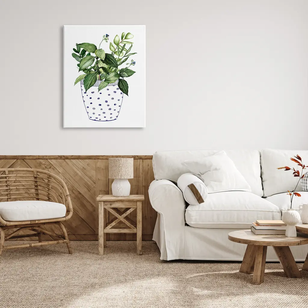 We create our stretched canvas to the highest standards. Using only the highest quality inks and canvas on Mimaki printers, we hand-cut and stretch each piece over a 1.5-inch thick wooden frame for hanging. As a result, the art comes ready to hang on the sturdy ledge with no installation required. Stupell Wall Art is made in the USA.Features: Dimensions: 16 x 1.5 x 20 InchesStretched Canvas Sizes Include Standard: 16 x 1.5 x 20 Large: 20 x 1.5 x 30 X-Large: 30 x 1.5 x 40 Oversized: 36 x 1.5 x 48Wall Art is Ready to Hang with Hardware Free Hanging. No installation required. For Easy Set Up Lean or Layer Artwork on Shelf or Against Wall.Our stretched canvas is created with the highest standards. We use only the highest quality inks and canvas on our in house Mimaki printers, and then hand cut and stretch each piece over a 1.5 inch thick wooden frame for hanging. Made In USA.Artwork Relates To: Leaf, Plant, Potted Plant, Pottery, Flower, Planter, Modern, Pattern, Polka DotsDesign by Karen Smith