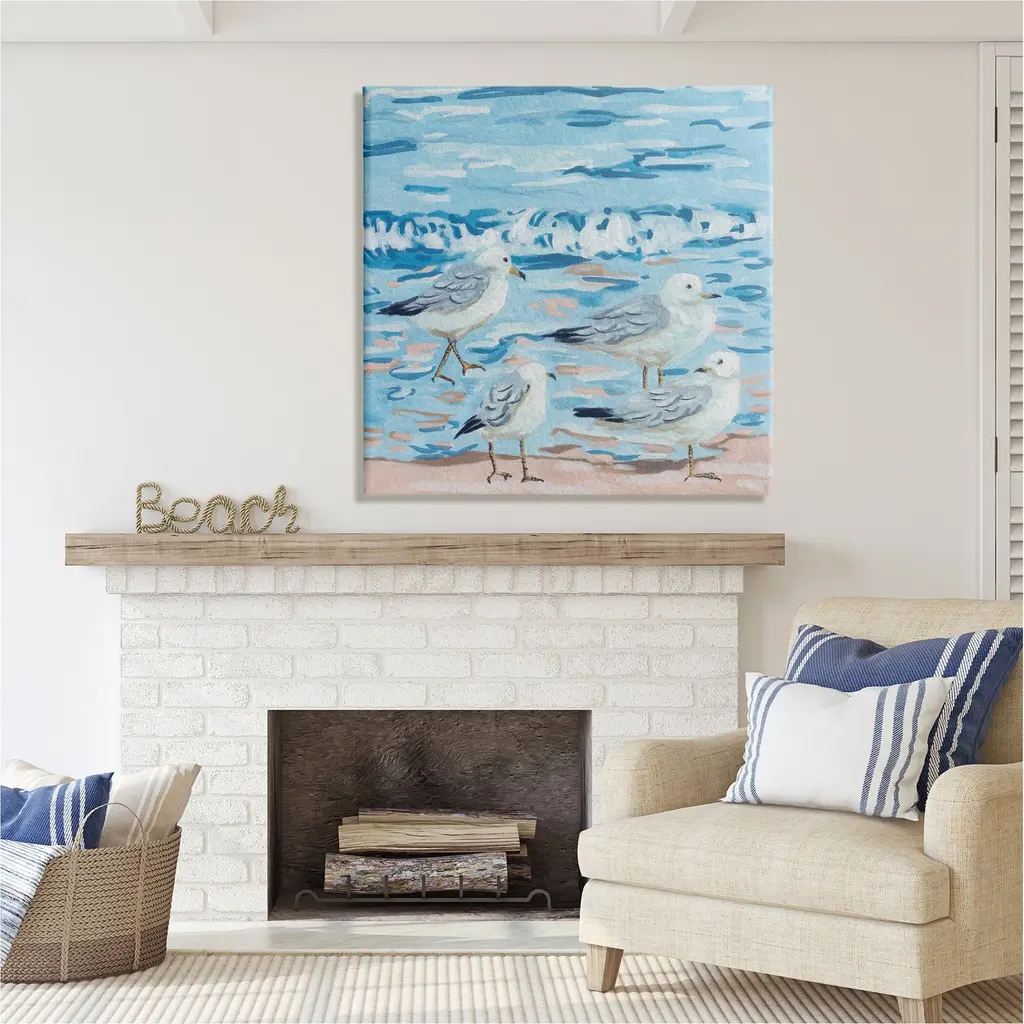 We create our stretched canvas to the highest standards. Using only the highest quality inks and canvas on Mimaki printers, we hand-cut and stretch each piece over a 1.5-inch thick wooden frame for hanging. As a result, the art comes ready to hang on the sturdy ledge with no installation required. Stupell Wall Art is made in the USA.Features: Dimensions: 17 x 1.5 x 17 InchesStretched Canvas Sizes Include Standard: 17 x 1.5 x 17 Large: 24 x 1.5 x 24 X-Large: 30 x 1.5 x 30 Oversized: 36 x 1.5 x 36Wall Art is Ready to Hang with Hardware Free Hanging. No installation required. For Easy Set Up Lean or Layer Artwork on Shelf or Against Wall.Our stretched canvas is created with the highest standards. We use only the highest quality inks and canvas on our in house Mimaki printers, and then hand cut and stretch each piece over a 1.5 inch thick wooden frame for hanging. Made In USA.Artwork Relates To: Animal, Bird, Waterfowl, Sandpipers, Beach, Shore, SeagullsDesign by Melissa Wang