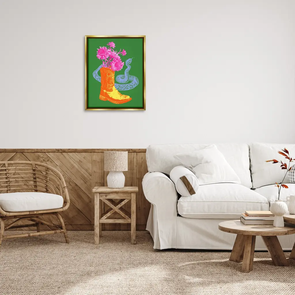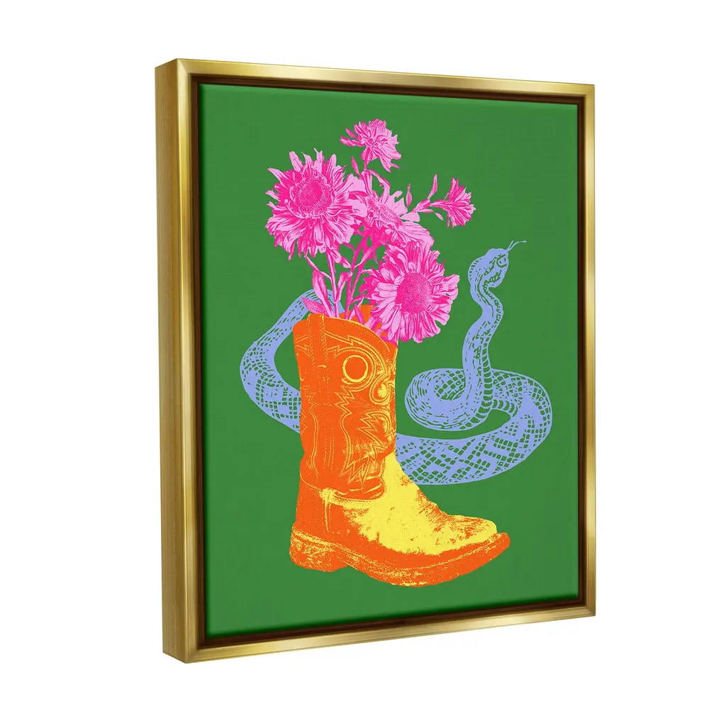 Elevate your home or office to the next level with Stupell Framed Floating Canvas Wall Art. Our premium hand-stretched canvas is mounted securely into a sturdy lightweight frame. The museum-style gap between the wrapped canvas and the box frame gives the illusion of floating artwork. Stupell Wall Art is made in the USA.Features: Dimensions: 17 x 1.7 x 21 Frame, 16 x 1.5 x 20 Canvas ArtFloating Frame Canvas Products are available in sizes 17"x21" and 25"x31". All Floating Frame Canvas Products have a 1.7" Depth.Wall Art is Ready to Hang with Hardware Free Hanging. No Installation required. For Easy Set Up Lean or Layer Artwork on Shelf or Against Wall. Artwork is Permently Fixed into the Frame.Our elevated 1.7" Thick Floating Frame is the perfect complement to our canvas style Wall Art. We use only the highest quality inks in house with industry leading printing solutions. Canvas is hand stretched over a durable wood foundation and then mounted securly into a Modern Box Frame. Made in the USA.Artwork Relates To: Floral, Pattern, Flower, Plant, Cowboy Boot, Animal, Reptile, Snake, Bouquet, Sunflower, Abstract, ModernDesign by Victoria Barnes