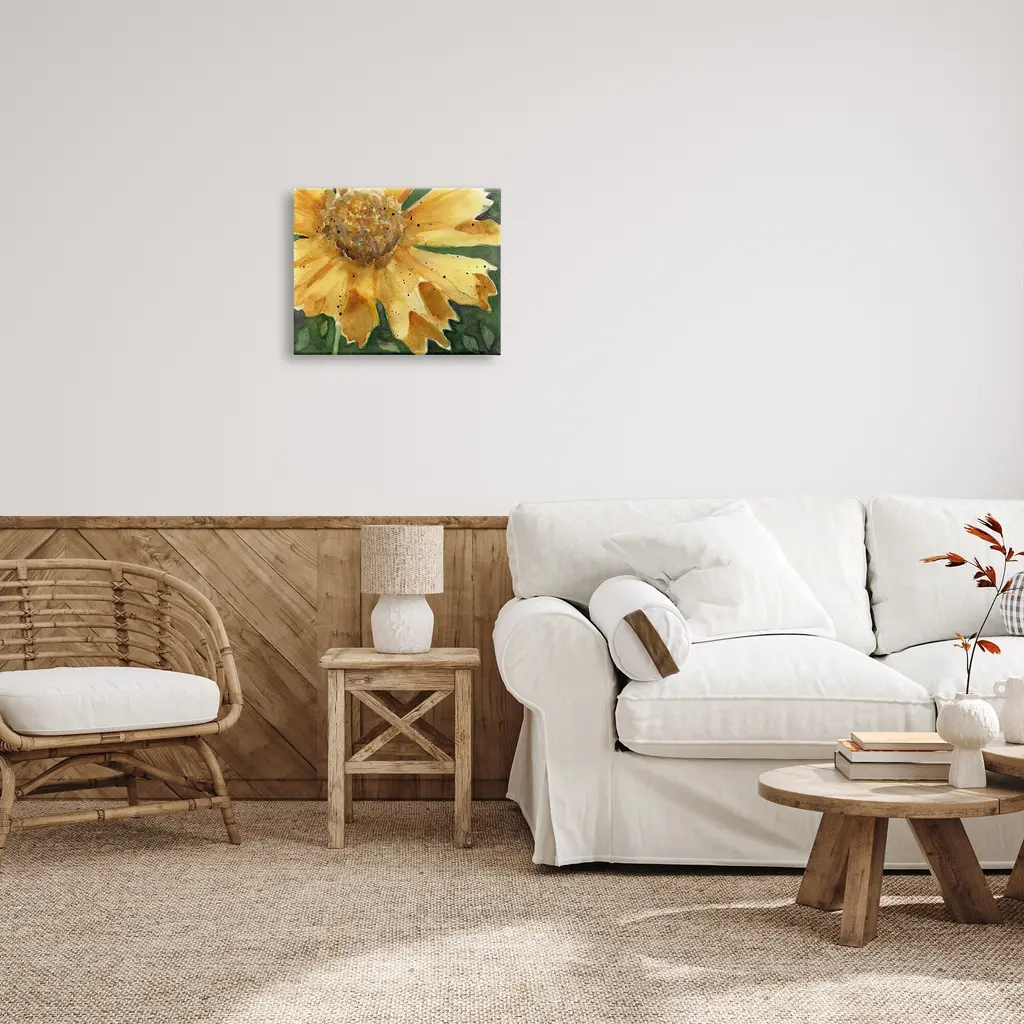 We create our stretched canvas to the highest standards. Using only the highest quality inks and canvas on Mimaki printers, we hand-cut and stretch each piece over a 1.5-inch thick wooden frame for hanging. As a result, the art comes ready to hang on the sturdy ledge with no installation required. Stupell Wall Art is made in the USA.Features: Dimensions: 20 x 1.5 x 16 InchesStretched Canvas Sizes Include Standard: 20 x 1.5 x 16 Large: 30 x 1.5 x 20 X-Large: 40 x 1.5 x 30 Oversized: 48 x 1.5 x 36Wall Art is Ready to Hang with Hardware Free Hanging. No installation required. For Easy Set Up Lean or Layer Artwork on Shelf or Against Wall.Our stretched canvas is created with the highest standards. We use only the highest quality inks and canvas on our in house Mimaki printers, and then hand cut and stretch each piece over a 1.5 inch thick wooden frame for hanging. Made In USA.Artwork Relates To: Flower, Petal, Plant, Daisy, Painting, Sunflower, Botanical, Country, Watercolor, ModernDesign by Gloria Palmer