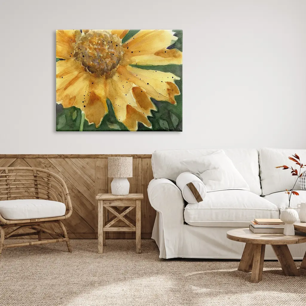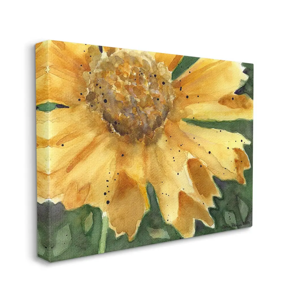 We create our stretched canvas to the highest standards. Using only the highest quality inks and canvas on Mimaki printers, we hand-cut and stretch each piece over a 1.5-inch thick wooden frame for hanging. As a result, the art comes ready to hang on the sturdy ledge with no installation required. Stupell Wall Art is made in the USA.Features: Dimensions: 20 x 1.5 x 16 InchesStretched Canvas Sizes Include Standard: 20 x 1.5 x 16 Large: 30 x 1.5 x 20 X-Large: 40 x 1.5 x 30 Oversized: 48 x 1.5 x 36Wall Art is Ready to Hang with Hardware Free Hanging. No installation required. For Easy Set Up Lean or Layer Artwork on Shelf or Against Wall.Our stretched canvas is created with the highest standards. We use only the highest quality inks and canvas on our in house Mimaki printers, and then hand cut and stretch each piece over a 1.5 inch thick wooden frame for hanging. Made In USA.Artwork Relates To: Flower, Petal, Plant, Daisy, Painting, Sunflower, Botanical, Country, Watercolor, ModernDesign by Gloria Palmer