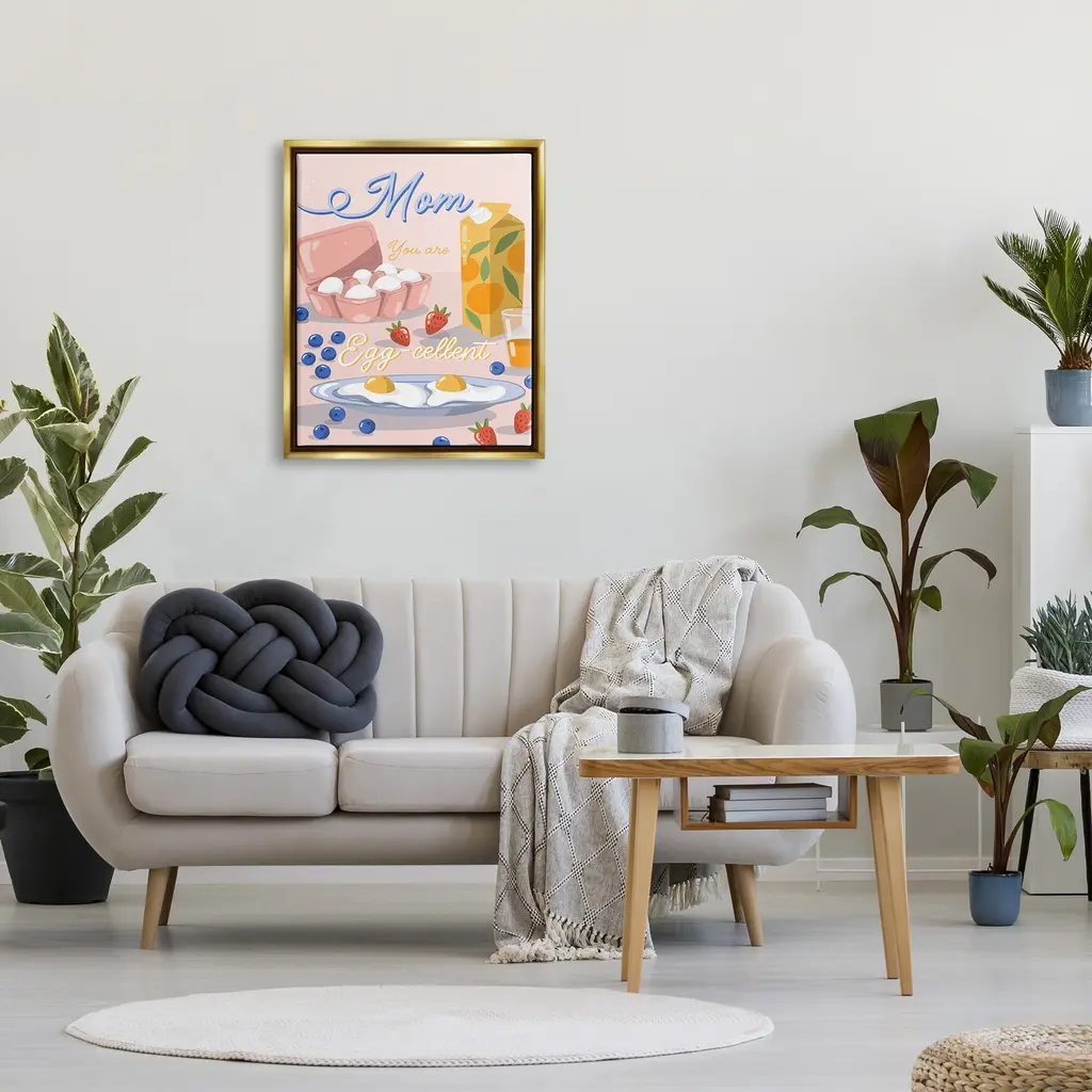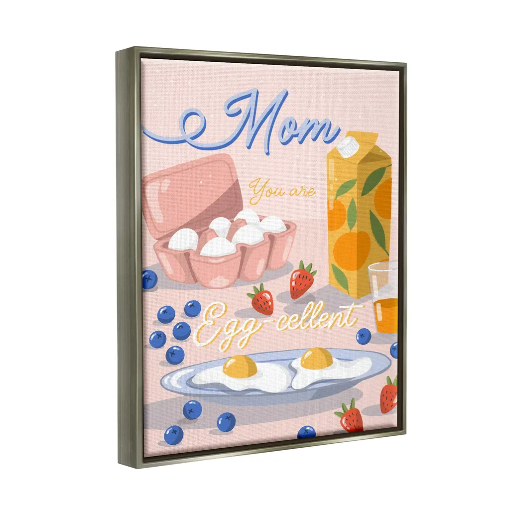 Elevate your home or office to the next level with Stupell Framed Floating Canvas Wall Art. Our premium hand-stretched canvas is mounted securely into a sturdy lightweight frame. The museum-style gap between the wrapped canvas and the box frame gives the illusion of floating artwork. Stupell Wall Art is made in the USA.Features: Dimensions: 17 x 1.7 x 21 Frame, 16 x 1.5 x 20 Canvas ArtFloating Frame Sizes Include Standard: 17 x 1.7 x 21 Oversized: 25 x 1.7 x 31Wall Art is Ready to Hang - No Installation or Hardware Needed. For Easy Set Up Lean or Layer Artwork on Shelf or Against Wall.Our elevated 1.7" Thick Floating Frame is the perfect complement to our canvas style Wall Art. We use only the highest quality inks in house with industry leading printing solutions. Canvas is hand stretched over a durable wood foundation and then mounted securly into a Modern Box Frame. Made in the USA.Artwork Relates To: Food, Eggs, Breakfast, Orange Juice, Berries, Mother's Day, Mom You Are Egg-cellentDesign by Dominika Godette