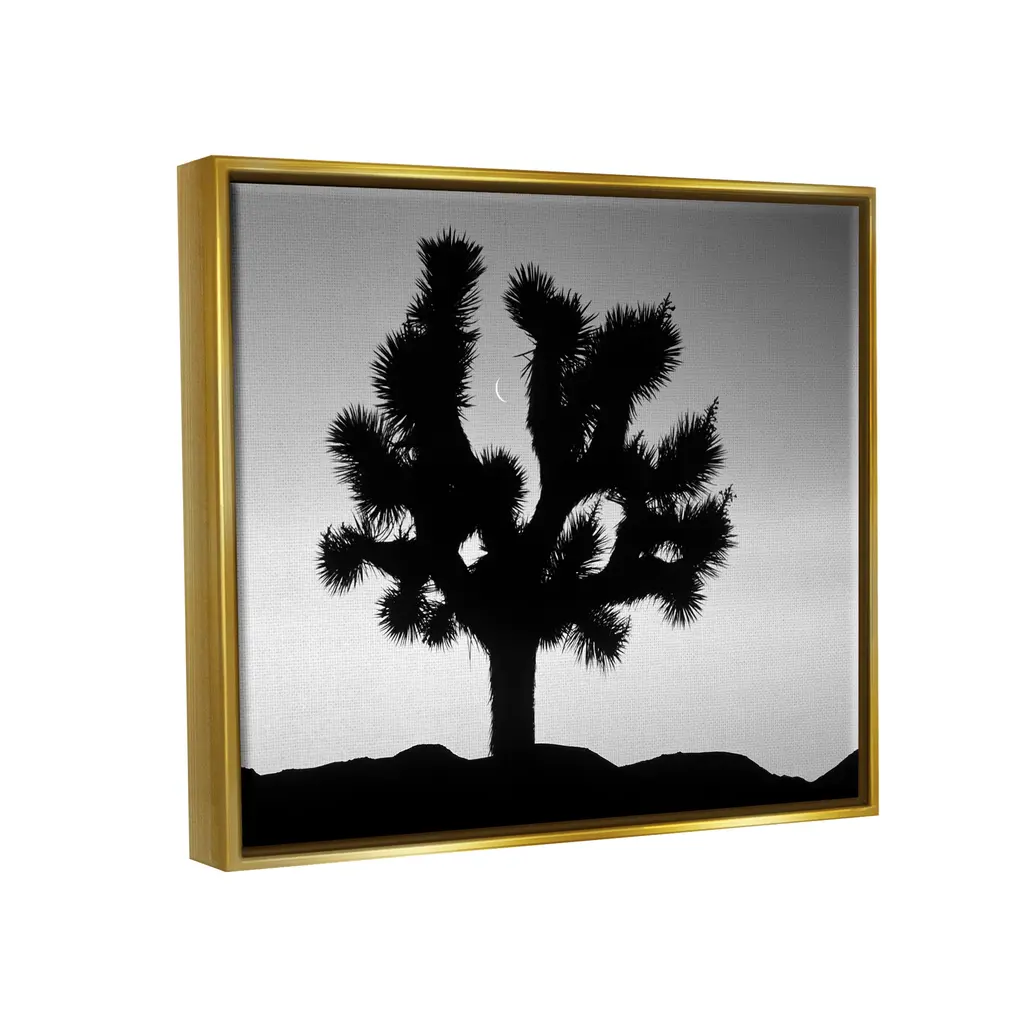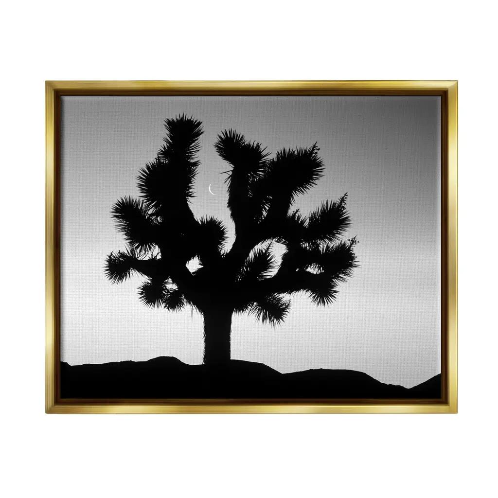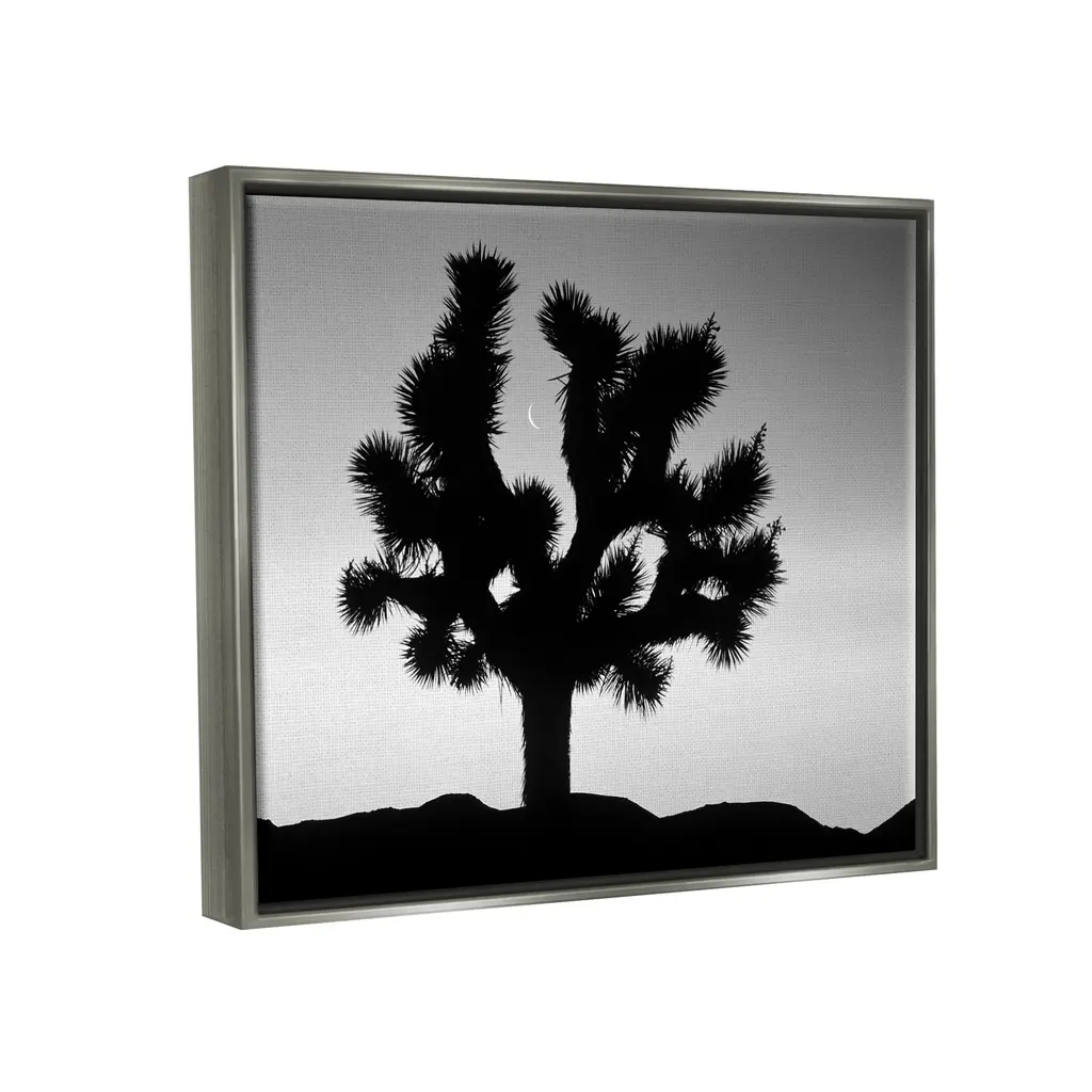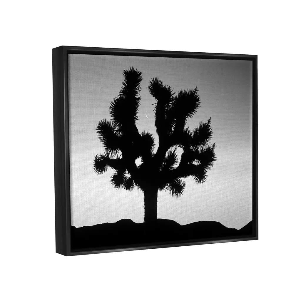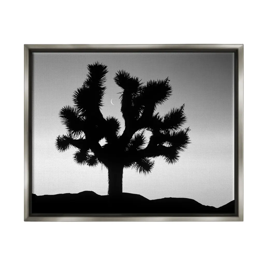 Elevate your home or office to the next level with Stupell Framed Floating Canvas Wall Art. Our premium hand-stretched canvas is mounted securely into a sturdy lightweight frame. The museum-style gap between the wrapped canvas and the box frame gives the illusion of floating artwork. Stupell Wall Art is made in the USA.Features: Dimensions: 21 x 1.7 x 17 Frame, 20 x 1.5 x 16 Canvas ArtFloating Frame Sizes Include Standard: 21 x 1.7 x 17 Oversized: 31 x 1.7 x 25Wall Art is Ready to Hang - No Installation or Hardware Needed. For Easy Set Up Lean or Layer Artwork on Shelf or Against Wall.Our elevated 1.7" Thick Floating Frame is the perfect complement to our canvas style Wall Art. We use only the highest quality inks in house with industry leading printing solutions. Canvas is hand stretched over a durable wood foundation and then mounted securly into a Modern Box Frame. Made in the USA.Artwork Relates To: Silhouette, Desert, Tree, Moon, Monochrome, PhotographyDesign by Dennis Frates