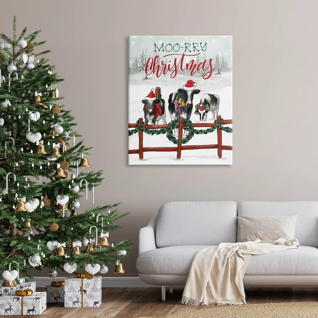 Proudly made in the USA, Our stretched canvas is created with the highest standards. We use only the highest quality inks and canvas on our in house Mimaki printers, and then hand cut and stretch each piece over a 1.5 inch thick wooden frame for hanging. The art comes ready to hang with no installation required.Features: Dimensions: 16 x 1.5 x 20 InchesStretched Canvas Sizes Include Standard: 16 x 1.5 x 20 Large: 20 x 1.5 x 30 X-Large: 30 x 1.5 x 40 Oversized: 36 x 1.5 x 48Wall Art is Ready to Hang - No Installation or Hardware Needed. For Easy Set Up Lean or Layer Artwork on Shelf or Against Wall.Our stretched canvas is created with the highest standards. We use only the highest quality inks and canvas on our in house Mimaki printers, and then hand cut and stretch each piece over a 1.5 inch thick wooden frame for hanging. Made In USA.Artwork Relates To: Cow, Cattle, Mammal, Animal, Snow, Farm, Santa Hat, Wreath, Seasonal, HolidayDesign by Caverly SmithLiving Room, Den, Hallway, Office, Entryway, Study, Dining Room or Bed Room.Text Includes: Moo-rry Christmas