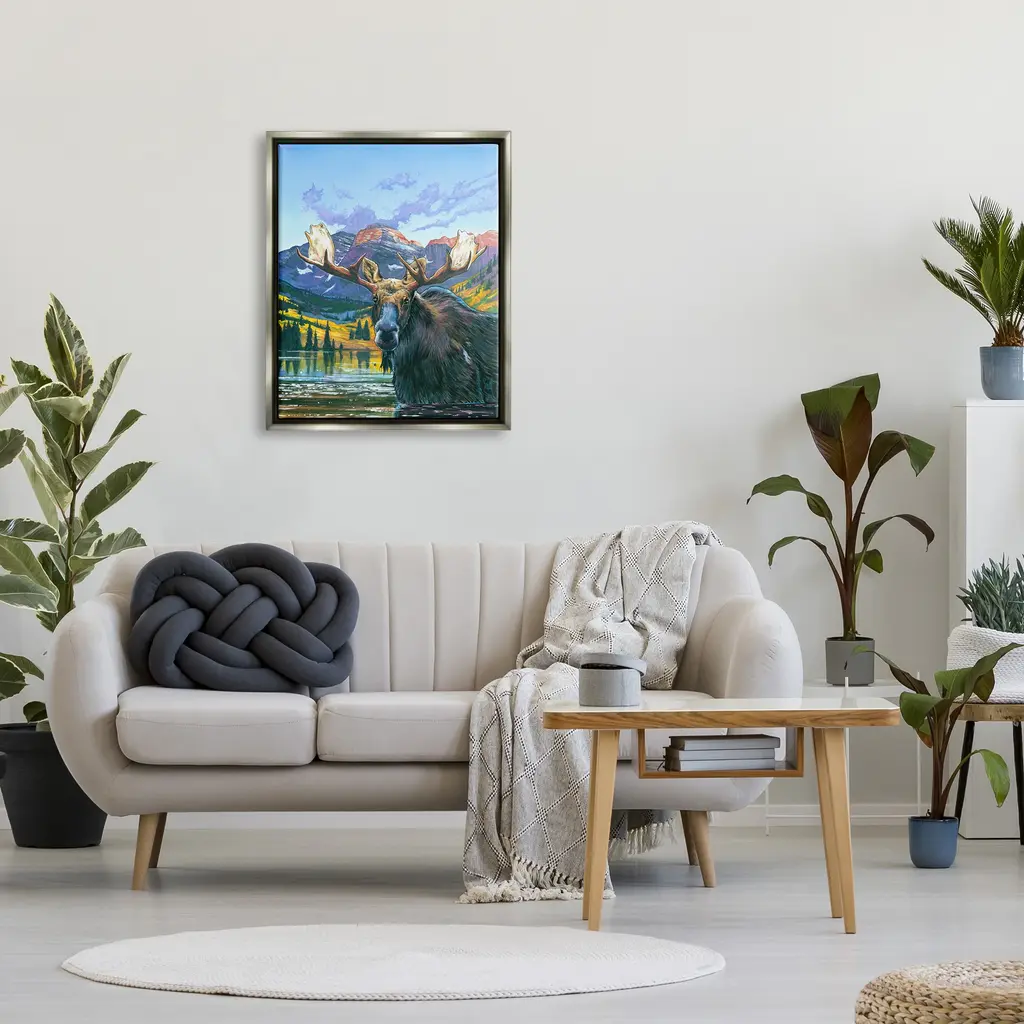 Elevate your home or office to the next level with Stupell Framed Floating Canvas Wall Art. Our premium hand-stretched canvas is mounted securely into a sturdy lightweight frame. The museum-style gap between the wrapped canvas and the box frame gives the illusion of floating artwork. Stupell Wall Art is made in the USA.Features: Dimensions: 17 x 1.7 x 21 Frame, 16 x 1.5 x 20 Canvas ArtFloating Frame Sizes Include Standard: 17 x 1.7 x 21 Oversized: 25 x 1.7 x 31Wall Art is Ready to Hang with Hardware Free Hanging. No installation required. For Easy Set Up Lean or Layer Artwork on Shelf or Against Wall.Our elevated 1.7" Thick Floating Frame is the perfect complement to our canvas style Wall Art. We use only the highest quality inks in house with industry leading printing solutions. Canvas is hand stretched over a durable wood foundation and then mounted securly into a Modern Box Frame. Made in the USA.Artwork Relates To: Animal, Mammal, Wildlife, Antler, Tree, Nature, Wilderness, Mountain, Mountain Range, Moose, Land, Woodland, RiverDesign by Scott Westmoreland