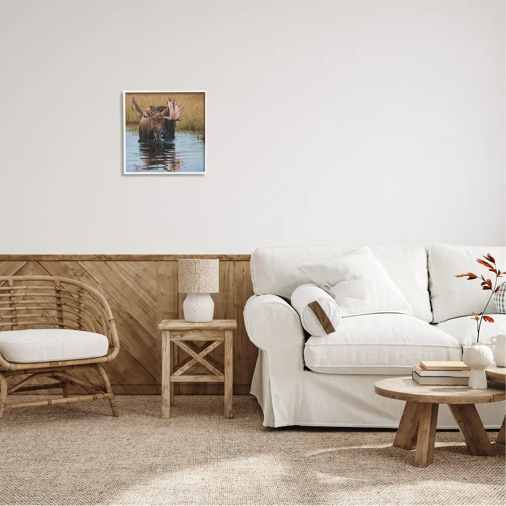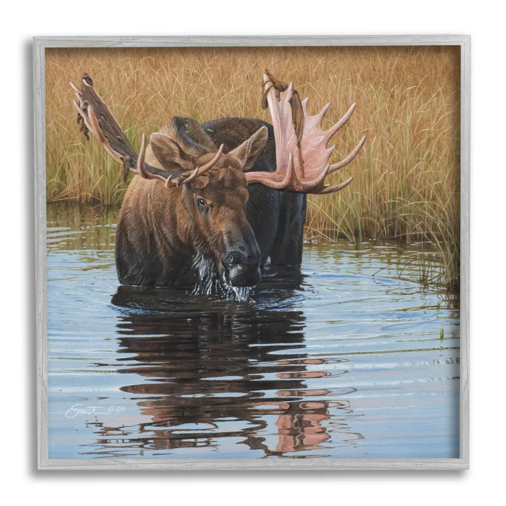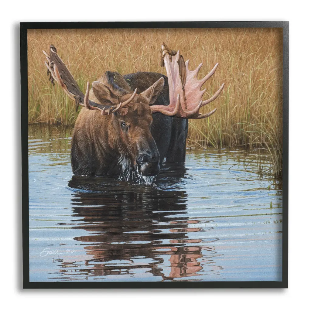 Add dimension to any room with our textured Framed Giclee Artwork. Our framed artwork is securely mounted into a 1.5-inch thick wood grain frame and ready to hang. Frames are available in three alluring styles: black, gray farmhouse and white. In addition, you should check out our oversized options if you want a statement piece. Stupell Wall Art is made in the USA.Features: Dimensions: 12 x 1.5 x 12 FramedFramed Giclee Sizes Include Standard: 12 x 1.5 x 12 Large: 17 x 1.5 x 17 Oversized: 24 x 1.5 x 24Wall Art is Ready to Hang - No Installation or Hardware Needed. For Easy Set Up Lean or Layer Artwork on Shelf or Against Wall.Our giclée prints are carefully mounted on a durable MDF backing, and then perfectly finished in a 1.5 inch thick woodgrain frame. Mounted frame colors include black, gray farmhouse and white. Made In USA.Artwork Relates To: Animal, Mammal, Moose, Wildlife, Nature, PondDesign by Daniel Smith