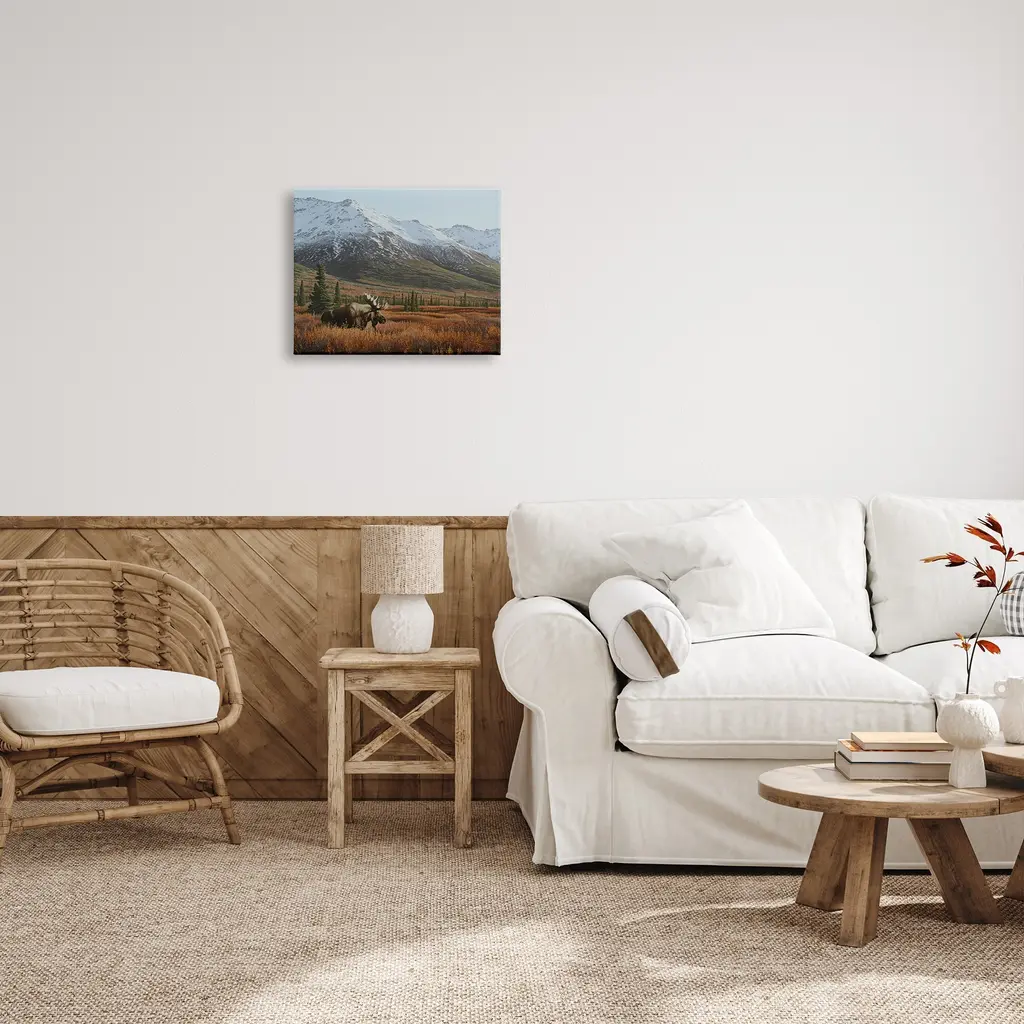 We create our stretched canvas to the highest standards. Using only the highest quality inks and canvas on Mimaki printers, we hand-cut and stretch each piece over a 1.5-inch thick wooden frame for hanging. As a result, the art comes ready to hang on the sturdy ledge with no installation required. Stupell Wall Art is made in the USA.Features: Dimensions: 20 x 1.5 x 16 InchesStretched Canvas Sizes Include Standard: 20 x 1.5 x 16 Large: 30 x 1.5 x 20 X-Large: 40 x 1.5 x 30 Oversized: 48 x 1.5 x 36Wall Art is Ready to Hang with Hardware Free Hanging. No installation required. For Easy Set Up Lean or Layer Artwork on Shelf or Against Wall.Our stretched canvas is created with the highest standards. We use only the highest quality inks and canvas on our in house Mimaki printers, and then hand cut and stretch each piece over a 1.5 inch thick wooden frame for hanging. Made In USA.Artwork Relates To: Animal, Mammal, Moose, Wildlife, Mountain, Landscape, SceneryDesign by Clinton Jammer