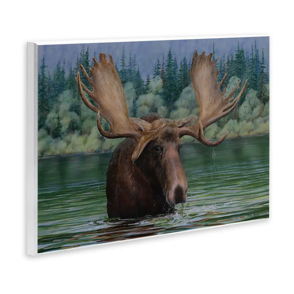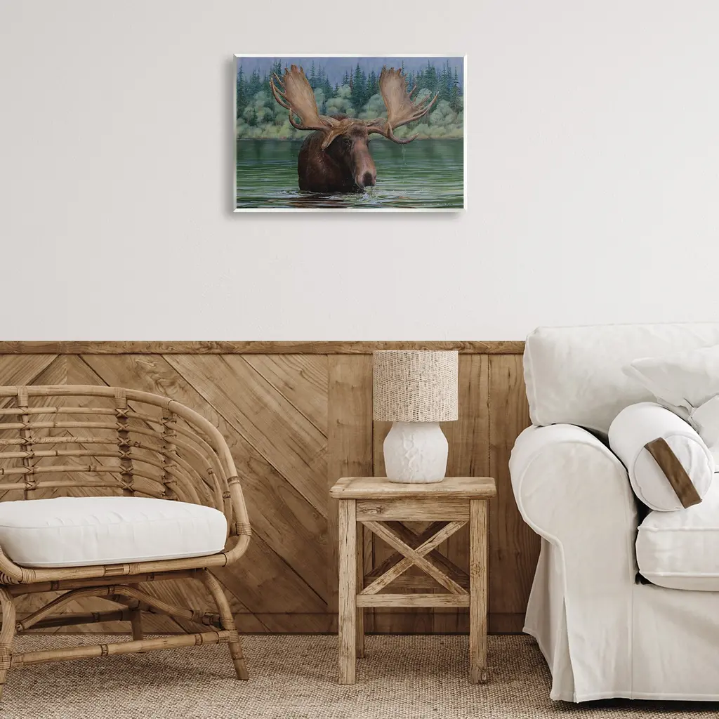 Our wall plaques start as high-quality lithograph prints mounted on durable 0.5-inch thick MDF wood. Each piece is hand finished and comes with a fresh layer of white foil on the sides to give it a crisp, clean look. Plaques arrive ready to hang without installation and come with removable plastic corners to keep them from damage in transit. Stupell Wall Art is made in the USA.Features: Dimensions: 15 x 0.5 x 10 InchesWall Plaque Product Sizes Include 15"x10" and 19"x13". All wall plaque products have a 0.5" Depth. Wall Art is Ready to Hang with Hardware Free Hanging. No installation required. For Easy Set Up Lean or Layer Artwork on Shelf or Against Wall.All of our wall plaques start off as high quality lithograph prints that are then mounted on durable 0.5 inch thick MDF wood. Each piece is hand finished and comes with a fresh layer of foil on the sides to give it a crisp clean look. Made In USA.Artwork Relates To: Landscape, Nature, Lake, Pond, Wildlife, Animal, MooseDesign by Valerie Rogers