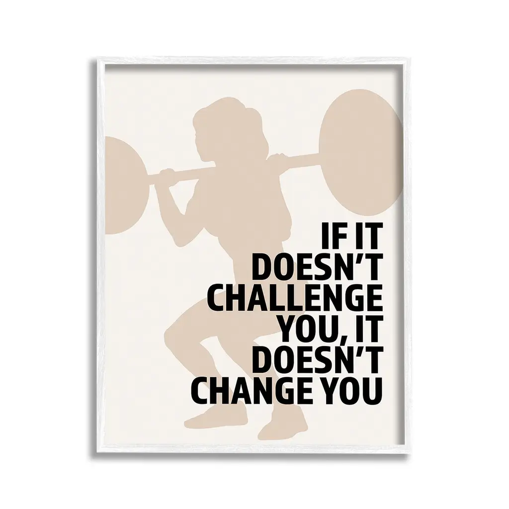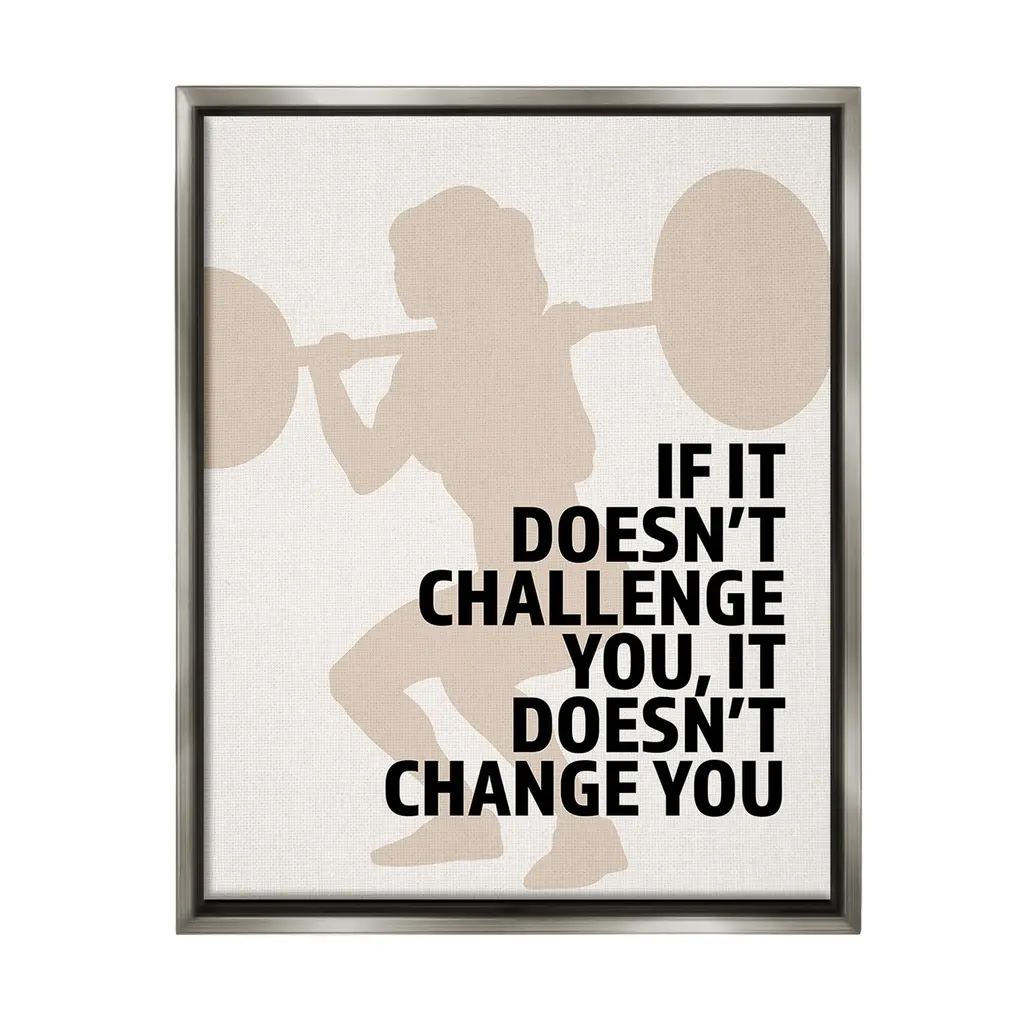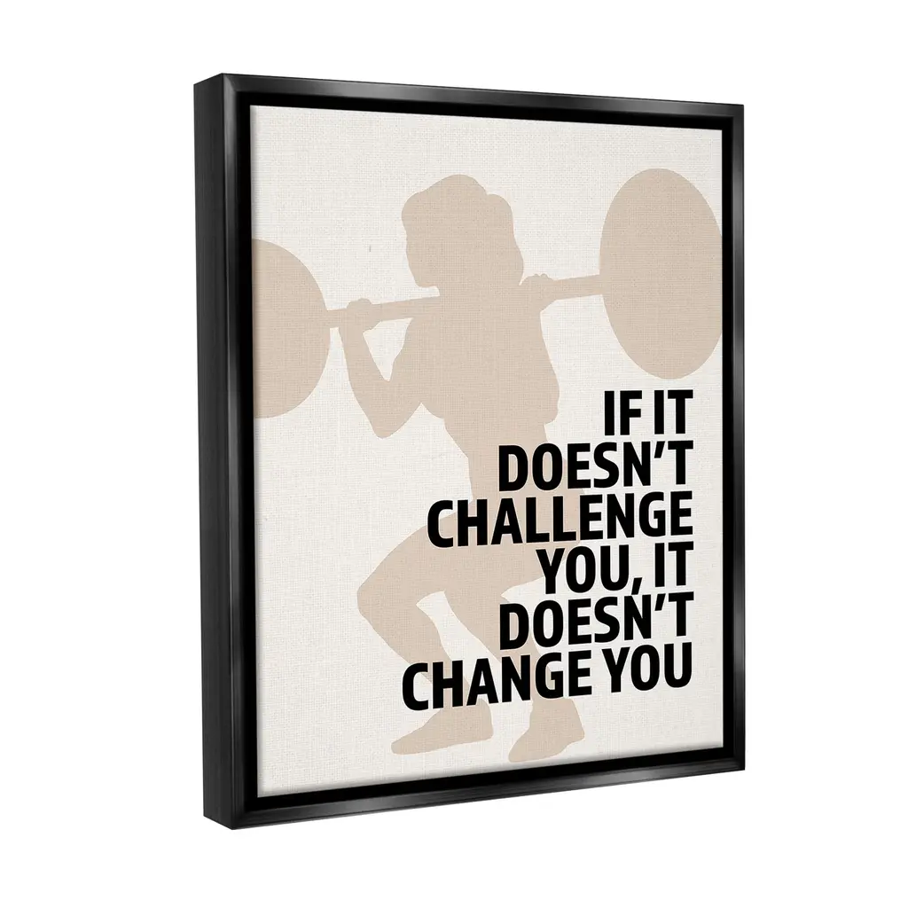 Elevate your home or office to the next level with Stupell Framed Floating Canvas Wall Art. Our premium hand-stretched canvas is mounted securely into a sturdy lightweight frame. The museum-style gap between the wrapped canvas and the box frame gives the illusion of floating artwork. Stupell Wall Art is made in the USA.Features: Dimensions: 17 x 1.7 x 21 Frame, 16 x 1.5 x 20 Canvas ArtFloating Frame Canvas Products are available in sizes 17"x21" and 25"x31". All Floating Frame Canvas Products have a 1.7" Depth.Wall Art is Ready to Hang with Hardware Free Hanging. No Installation required. For Easy Set Up Lean or Layer Artwork on Shelf or Against Wall. Artwork is Permently Fixed into the Frame.Our elevated 1.7" Thick Floating Frame is the perfect complement to our canvas style Wall Art. We use only the highest quality inks in house with industry leading printing solutions. Canvas is hand stretched over a durable wood foundation and then mounted securly into a Modern Box Frame. Made in the USA.Artwork Relates To: Exercise, Fitness, Workout, Weightlifting, Inspirational, Motivational, If it doesn't Challenge You, It Doesn't Change YouDesign by Victoria Barnes