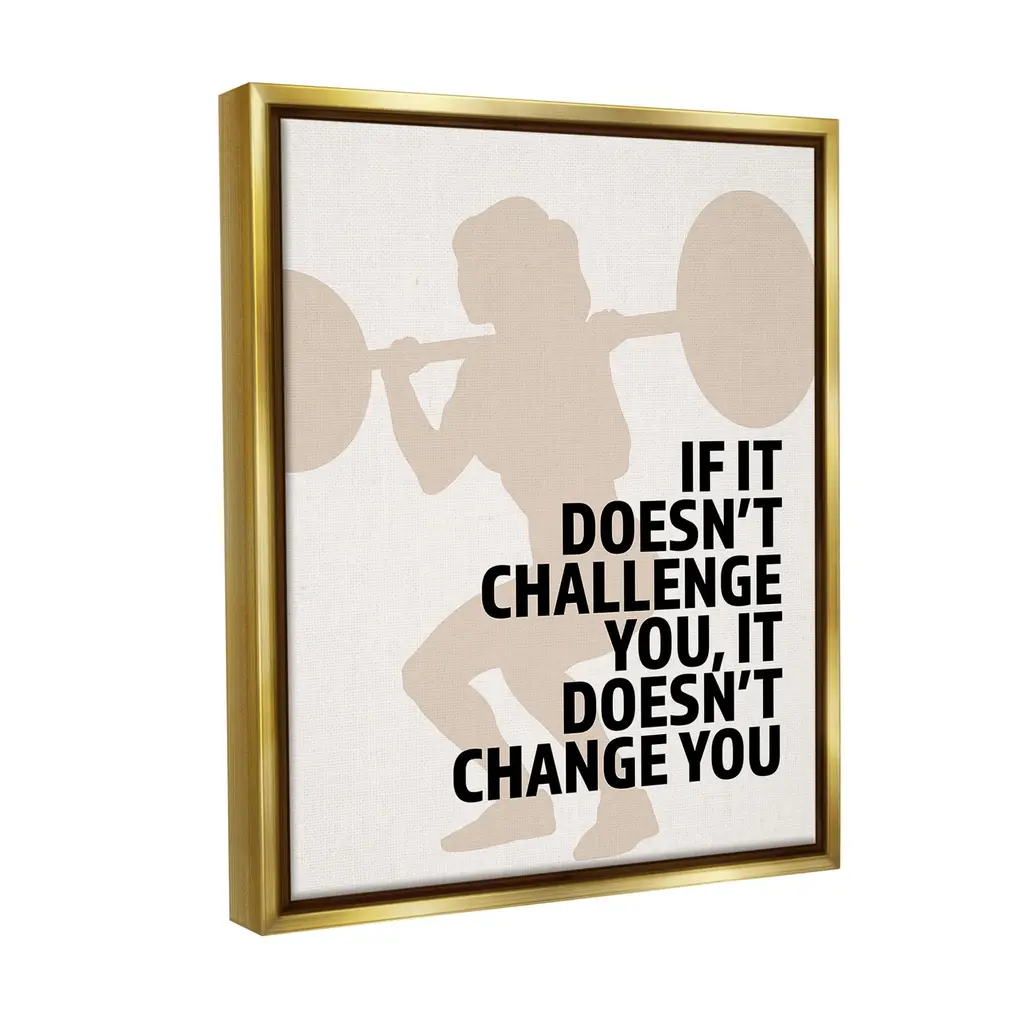 Elevate your home or office to the next level with Stupell Framed Floating Canvas Wall Art. Our premium hand-stretched canvas is mounted securely into a sturdy lightweight frame. The museum-style gap between the wrapped canvas and the box frame gives the illusion of floating artwork. Stupell Wall Art is made in the USA.Features: Dimensions: 17 x 1.7 x 21 Frame, 16 x 1.5 x 20 Canvas ArtFloating Frame Canvas Products are available in sizes 17"x21" and 25"x31". All Floating Frame Canvas Products have a 1.7" Depth.Wall Art is Ready to Hang with Hardware Free Hanging. No Installation required. For Easy Set Up Lean or Layer Artwork on Shelf or Against Wall. Artwork is Permently Fixed into the Frame.Our elevated 1.7" Thick Floating Frame is the perfect complement to our canvas style Wall Art. We use only the highest quality inks in house with industry leading printing solutions. Canvas is hand stretched over a durable wood foundation and then mounted securly into a Modern Box Frame. Made in the USA.Artwork Relates To: Exercise, Fitness, Workout, Weightlifting, Inspirational, Motivational, If it doesn't Challenge You, It Doesn't Change YouDesign by Victoria Barnes
