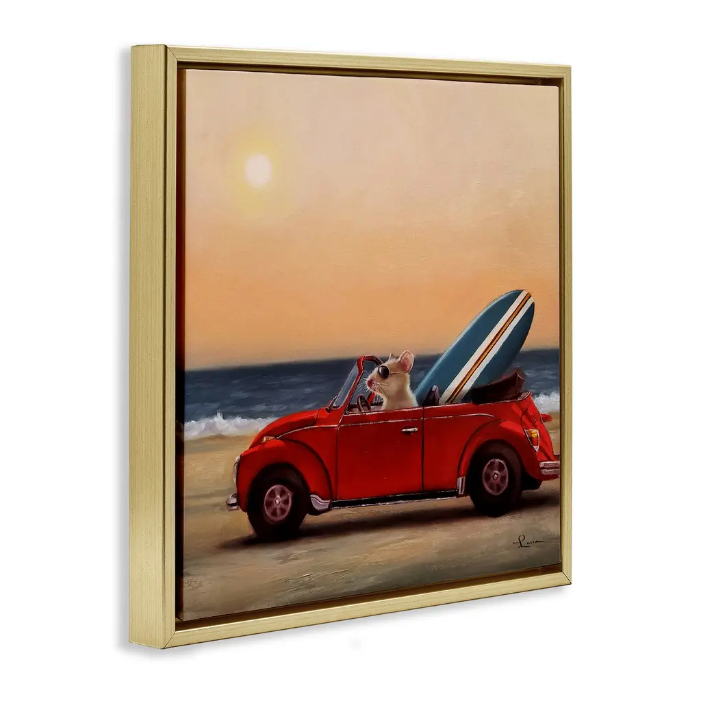 Elevate your home or office to the next level with Stupell Framed Floating Canvas Wall Art. Our premium hand-stretched canvas is mounted securely into a sturdy lightweight frame. The museum-style gap between the wrapped canvas and the box frame gives the illusion of floating artwork. Stupell Wall Art is made in the USA.Features: Dimensions: 18 x 1.7 x 18 Frame, 17 x 1.5 x 17 Canvas ArtFloating Frame Canvas Products are available in sizes 18"x18" and 25"x25". All Floating Frame Canvas Products have a 1.7" Depth.Wall Art is Ready to Hang with Hardware Free Hanging. No Installation required. For Easy Set Up Lean or Layer Artwork on Shelf or Against Wall. Artwork is Permently Fixed into the Frame.Our elevated 1.7" Thick Floating Frame is the perfect complement to our canvas style Wall Art. We use only the highest quality inks in house with industry leading printing solutions. Canvas is hand stretched over a durable wood foundation and then mounted securly into a Modern Box Frame. Made in the USA.Artwork Relates To: Animal, Mouse, Car, Beach, Surfboard, Summer, Humor, SumemrDesign by Lucia Heffernan