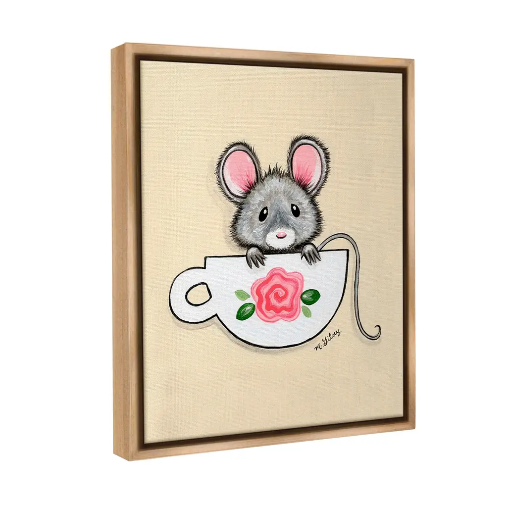 Elevate your home or office to the next level with Stupell Framed Floating Canvas Wall Art. Our premium hand-stretched canvas is mounted securely into a sturdy lightweight frame. The museum-style gap between the wrapped canvas and the box frame gives the illusion of floating artwork. Stupell Wall Art is made in the USA.Features: Dimensions: 17 x 1.7 x 21 Frame, 16 x 1.5 x 20 Canvas ArtFloating Frame Canvas Products are available in sizes 17"x21" and 25"x31". All Floating Frame Canvas Products have a 1.7" Depth.Wall Art is Ready to Hang with Hardware Free Hanging. No Installation required. For Easy Set Up Lean or Layer Artwork on Shelf or Against Wall. Artwork is Permently Fixed into the Frame.Our elevated 1.7" Thick Floating Frame is the perfect complement to our canvas style Wall Art. We use only the highest quality inks in house with industry leading printing solutions. Canvas is hand stretched over a durable wood foundation and then mounted securly into a Modern Box Frame. Made in the USA.Artwork Relates To: Animal, Mammal, Mouse, Rodent, Wildlife, Teacup, FlowerDesign by Michelle Gilsey