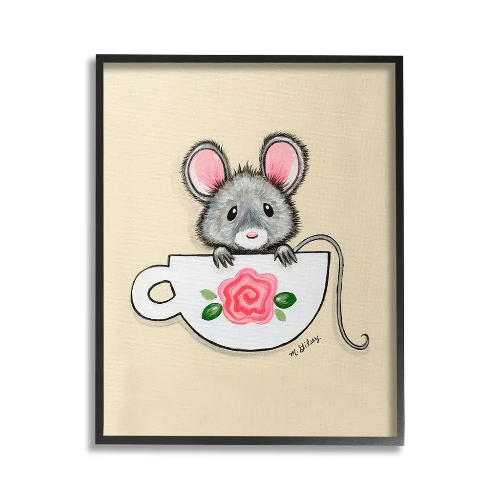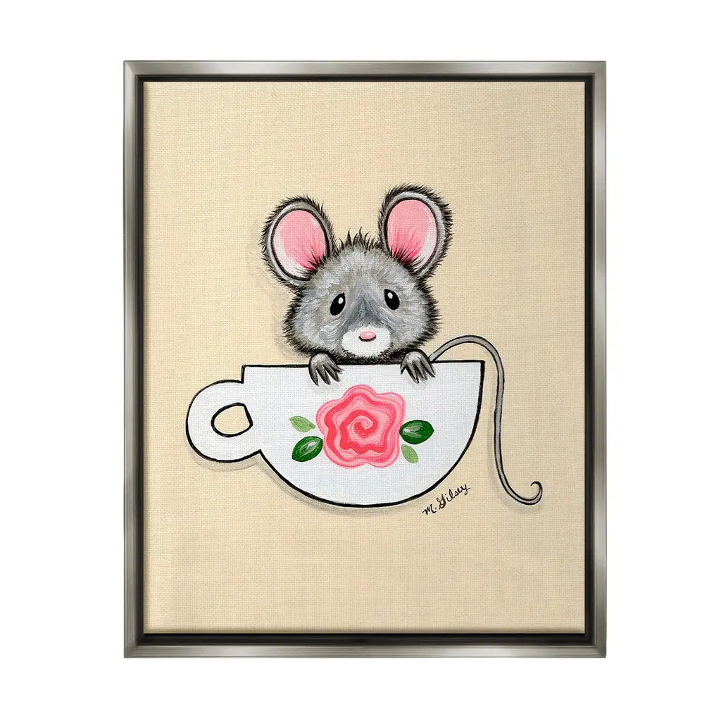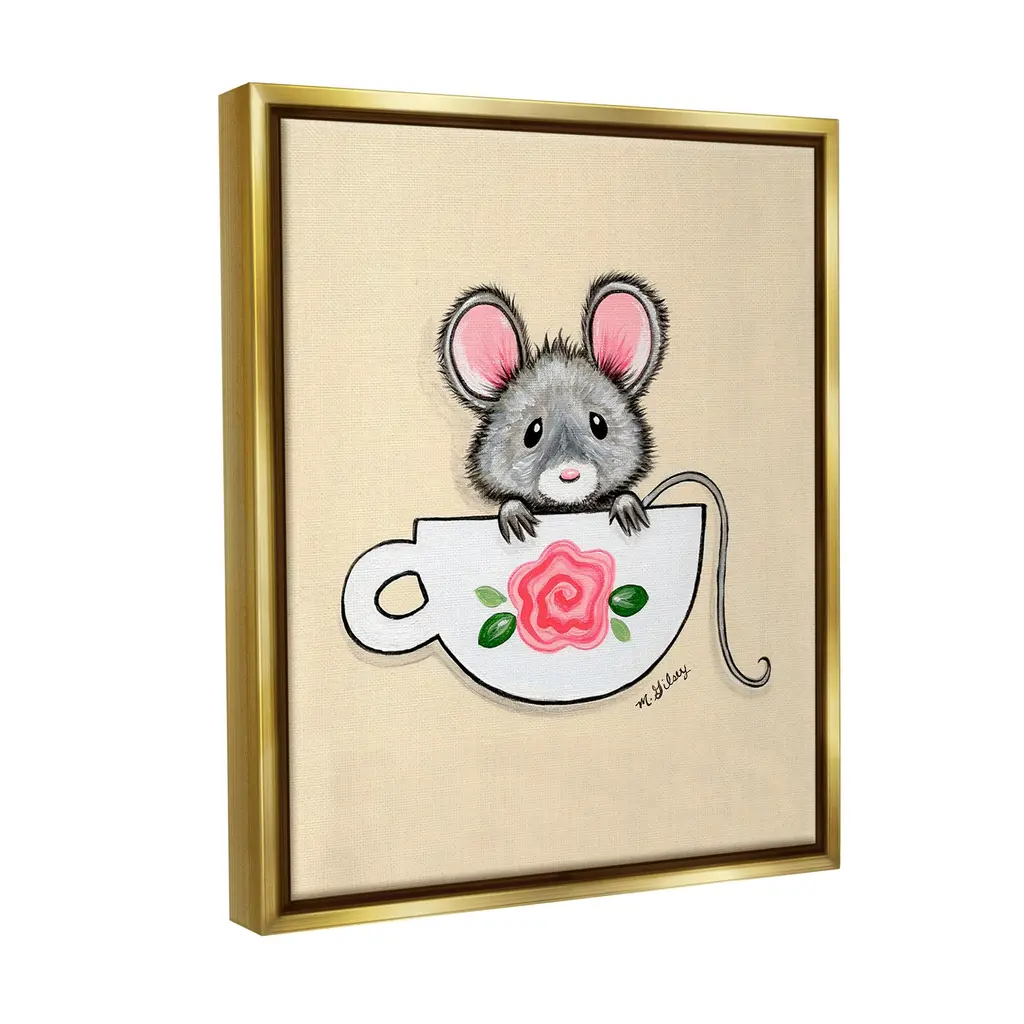 Elevate your home or office to the next level with Stupell Framed Floating Canvas Wall Art. Our premium hand-stretched canvas is mounted securely into a sturdy lightweight frame. The museum-style gap between the wrapped canvas and the box frame gives the illusion of floating artwork. Stupell Wall Art is made in the USA.Features: Dimensions: 17 x 1.7 x 21 Frame, 16 x 1.5 x 20 Canvas ArtFloating Frame Canvas Products are available in sizes 17"x21" and 25"x31". All Floating Frame Canvas Products have a 1.7" Depth.Wall Art is Ready to Hang with Hardware Free Hanging. No Installation required. For Easy Set Up Lean or Layer Artwork on Shelf or Against Wall. Artwork is Permently Fixed into the Frame.Our elevated 1.7" Thick Floating Frame is the perfect complement to our canvas style Wall Art. We use only the highest quality inks in house with industry leading printing solutions. Canvas is hand stretched over a durable wood foundation and then mounted securly into a Modern Box Frame. Made in the USA.Artwork Relates To: Animal, Mammal, Mouse, Rodent, Wildlife, Teacup, FlowerDesign by Michelle Gilsey