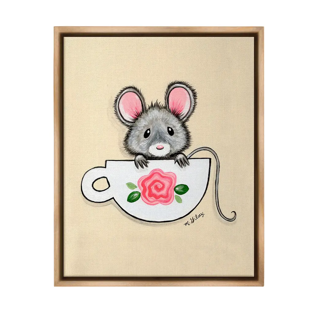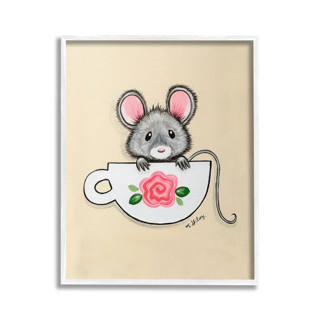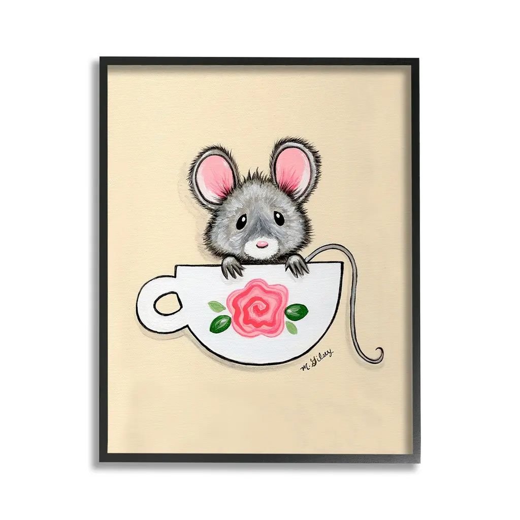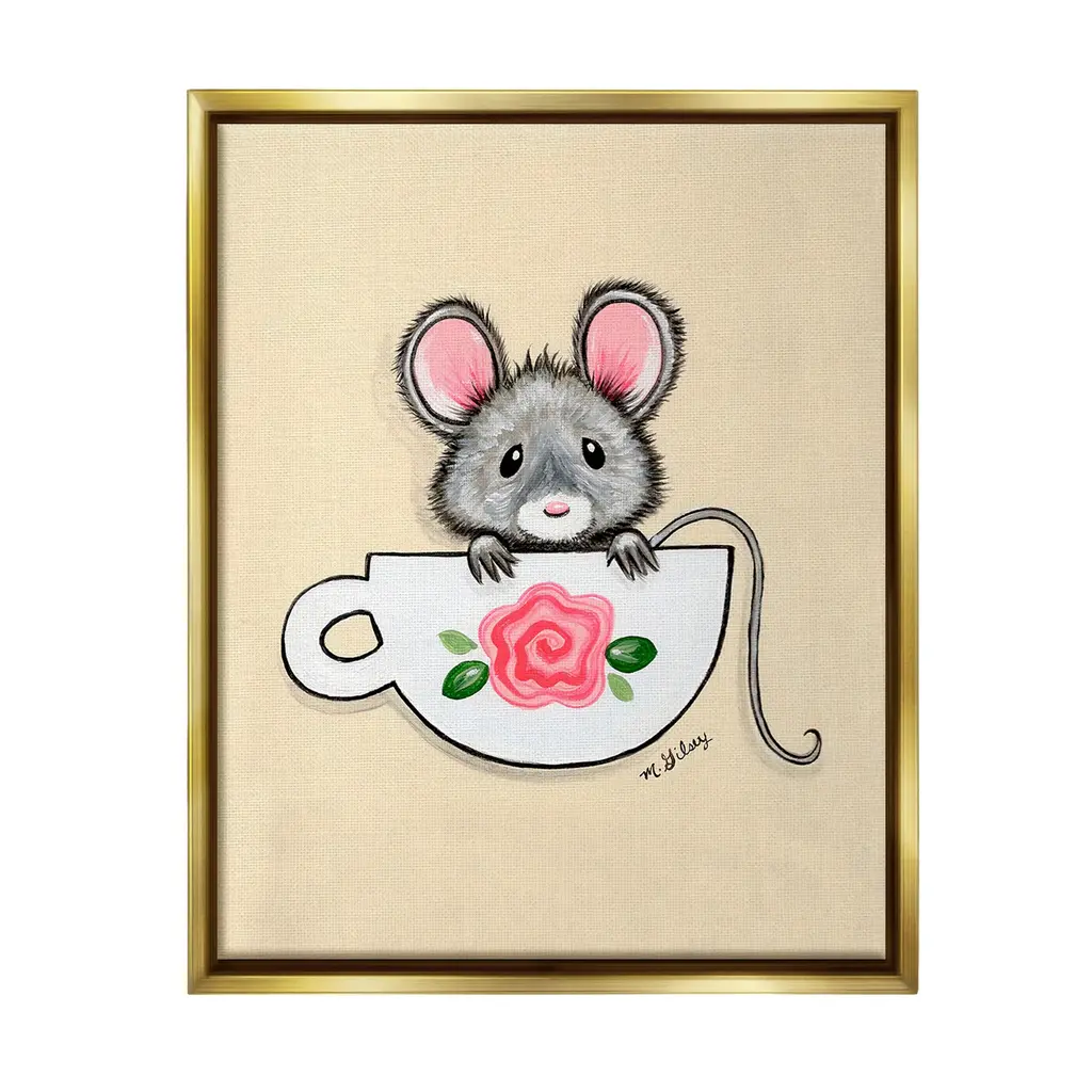 Elevate your home or office to the next level with Stupell Framed Floating Canvas Wall Art. Our premium hand-stretched canvas is mounted securely into a sturdy lightweight frame. The museum-style gap between the wrapped canvas and the box frame gives the illusion of floating artwork. Stupell Wall Art is made in the USA.Features: Dimensions: 17 x 1.7 x 21 Frame, 16 x 1.5 x 20 Canvas ArtFloating Frame Canvas Products are available in sizes 17"x21" and 25"x31". All Floating Frame Canvas Products have a 1.7" Depth.Wall Art is Ready to Hang with Hardware Free Hanging. No Installation required. For Easy Set Up Lean or Layer Artwork on Shelf or Against Wall. Artwork is Permently Fixed into the Frame.Our elevated 1.7" Thick Floating Frame is the perfect complement to our canvas style Wall Art. We use only the highest quality inks in house with industry leading printing solutions. Canvas is hand stretched over a durable wood foundation and then mounted securly into a Modern Box Frame. Made in the USA.Artwork Relates To: Animal, Mammal, Mouse, Rodent, Wildlife, Teacup, FlowerDesign by Michelle Gilsey