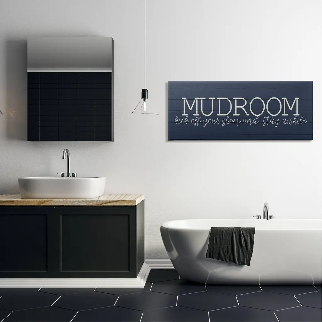 Proudly made in the USA, Our stretched canvas is created with the highest standards. We use only the highest quality inks and canvas on our in house Mimaki printers, and then hand cut and stretch each piece over a 1.5 inch thick wooden frame for hanging. The art comes ready to hang with no installation required.Features: Wall Art is Ready to Hang - No Installation or Hardware Needed. For Easy Set Up Lean or Layer Artwork on Shelf or Against Wall.Our stretched canvas is created with the highest standards. We use only the highest quality inks and canvas on our in house Mimaki printers, and then hand cut and stretch each piece over a 1.5 inch thick wooden frame for hanging. Made In USA.Artwork Relates To: MUDROOM kick off your shoes and stay awhile, Text, Grain Pattern, Calligraphy Design by Kim Allen