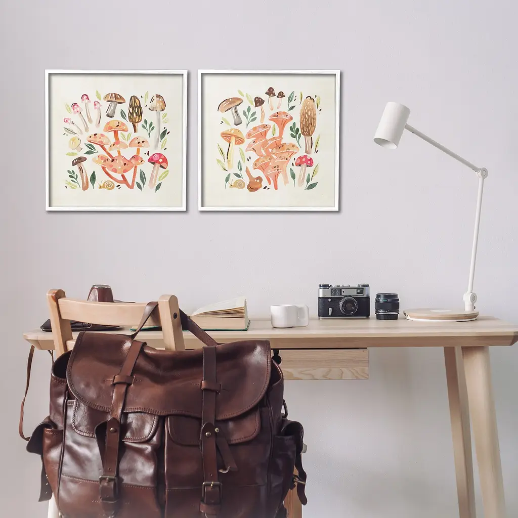 Fill any space in your home or office with our Framed Wall Art Sets. Our framed artwork is securely mounted into a 1.5-inch thick wood grain frame and ready to hang. Frames are available in three alluring styles: black, gray farmhouse and white. Stupell Wall Art is made in the USA.Features: Dimensions: 2 Piece Set, Each Panel is 12 x 1.5 x 12 FramedTwo Piece Framed Giclee Sets are available as 12"x12", 17"x17" or 24"x24" Panels. All Framed giclee Products have a 1.5" Depth.Wall Art is Ready to Hang with Hardware Free Hanging. No installation required. For Easy Set Up Lean or Layer Artwork on Shelf or Against Wall.Curated Wall Art Sets make it easy for you complete the theme for any room. Our giclée prints are carefully mounted on a durable MDF backing, and then perfectly finished in a 1.5 inch thick woodgrain frame. Mounted frame colors include black, gray farmhouse and white. Made In USA.Artwork Relates To: Fungus, Plant, Mushroom, Agaric, Botanical, Woodland, Leaf, Forest, PatternDesign by Annie Warren