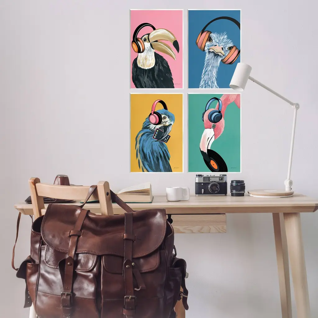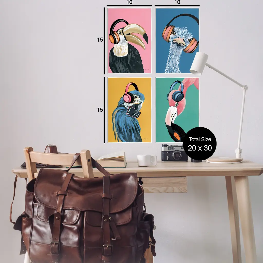 Fill any space with Stupell Wall Art Sets. Our wall plaques start as high-quality lithograph prints mounted on durable 0.5-inch thick MDF wood. Each piece is hand finished and comes with a fresh layer of white foil on the sides to give it a crisp, clean look. Plaques arrive ready to hang without installation and come with removable plastic corners to keep them from damage in transit. Stupell Wall Art is made in the USA.Features: Dimensions: 4 Piece Set, Each Panel is 10 x 0.5 x 15 InchesFour Piece Wall Plaque Sets are available as 10"x15" or 13"x19" Panels. All wall plaques have a 0.5" Depth.Wall Art is Ready to Hang with Hardware Free Hanging. No installation required. For Easy Set Up Lean or Layer Artwork on Shelf or Against Wall.All of our wall plaques start off as high quality lithograph prints that are then mounted on durable 0.5 inch thick MDF wood. Each piece is hand finished and comes with a fresh layer of foil on the sides to give it a crisp clean look. Made In USA.Artwork Relates To: Animal, Beak, Bird, Toucan, Headphones, Music, Flamingo, Tropical, Vinyl Record, OstrichDesign by Yvette St. Amant