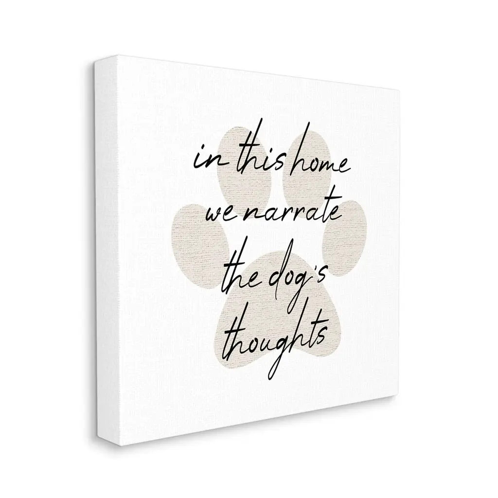 Proudly made in the USA, Our stretched canvas is created with the highest standards. We use only the highest quality inks and canvas on our in house Mimaki printers, and then hand cut and stretch each piece over a 1.5 inch thick wooden frame for hanging. The art comes ready to hang with no installation required.Features: Dimensions: 17 x 1.5 x 17 InchesStretched Canvas Sizes Include Standard: 17 x 1.5 x 17 Large: 24 x 1.5 x 24 X-Large: 30 x 1.5 x 30 Oversized: 36 x 1.5 x 36Wall Art is Ready to Hang - No Installation or Hardware Needed. For Easy Set Up Lean or Layer Artwork on Shelf or Against Wall.Our stretched canvas is created with the highest standards. We use only the highest quality inks and canvas on our in house Mimaki printers, and then hand cut and stretch each piece over a 1.5 inch thick wooden frame for hanging. Made In USA.Artwork Relates To: Paw, Dog, Pet, Animal, Humor, FunnyDesign by Daphne PolselliLiving Room, Den, Hallway, Office, Entryway, Study, Dining Room or Bed Room.Text Includes: In This Home We Narrate the Dog's Thoughts