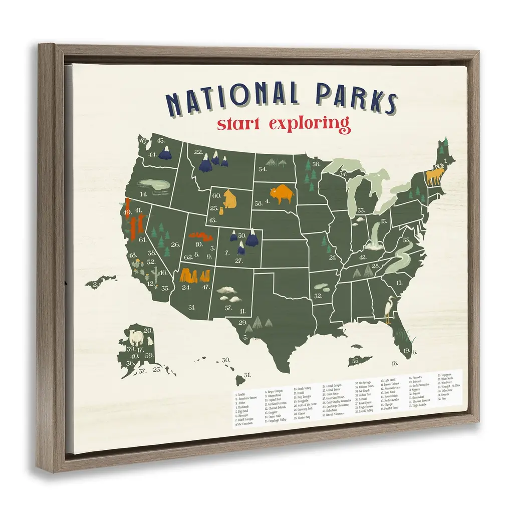 Elevate your home or office to the next level with Stupell Framed Floating Canvas Wall Art. Our premium hand-stretched canvas is mounted securely into a sturdy lightweight frame. The museum-style gap between the wrapped canvas and the box frame gives the illusion of floating artwork. Stupell Wall Art is made in the USA.Features: Dimensions: 21 x 1.7 x 17 Frame, 20 x 1.5 x 16 Canvas ArtFloating Frame Canvas Products are available in sizes 21"x17" and 31"x25". All Floating Frame Canvas Products have a 1.7" Depth.Wall Art is Ready to Hang with Hardware Free Hanging. No Installation required. For Easy Set Up Lean or Layer Artwork on Shelf or Against Wall. Artwork is Permently Fixed into the Frame.Our elevated 1.7" Thick Floating Frame is the perfect complement to our canvas style Wall Art. We use only the highest quality inks in house with industry leading printing solutions. Canvas is hand stretched over a durable wood foundation and then mounted securly into a Modern Box Frame. Made in the USA.Artwork Relates To: Map, United States, Educational, National Parks, TravelDesign by Daphne Polselli
