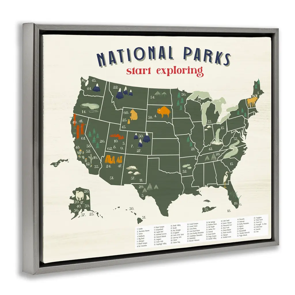 Elevate your home or office to the next level with Stupell Framed Floating Canvas Wall Art. Our premium hand-stretched canvas is mounted securely into a sturdy lightweight frame. The museum-style gap between the wrapped canvas and the box frame gives the illusion of floating artwork. Stupell Wall Art is made in the USA.Features: Dimensions: 21 x 1.7 x 17 Frame, 20 x 1.5 x 16 Canvas ArtFloating Frame Canvas Products are available in sizes 21"x17" and 31"x25". All Floating Frame Canvas Products have a 1.7" Depth.Wall Art is Ready to Hang with Hardware Free Hanging. No Installation required. For Easy Set Up Lean or Layer Artwork on Shelf or Against Wall. Artwork is Permently Fixed into the Frame.Our elevated 1.7" Thick Floating Frame is the perfect complement to our canvas style Wall Art. We use only the highest quality inks in house with industry leading printing solutions. Canvas is hand stretched over a durable wood foundation and then mounted securly into a Modern Box Frame. Made in the USA.Artwork Relates To: Map, United States, Educational, National Parks, TravelDesign by Daphne Polselli