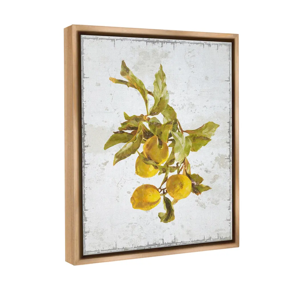 Elevate your home or office to the next level with Stupell Framed Floating Canvas Wall Art. Our premium hand-stretched canvas is mounted securely into a sturdy lightweight frame. The museum-style gap between the wrapped canvas and the box frame gives the illusion of floating artwork. Stupell Wall Art is made in the USA.Features: Dimensions: 17 x 1.7 x 21 Frame, 16 x 1.5 x 20 Canvas ArtFloating Frame Canvas Products are available in sizes 17"x21" and 25"x31". All Floating Frame Canvas Products have a 1.7" Depth.Wall Art is Ready to Hang with Hardware Free Hanging. No Installation required. For Easy Set Up Lean or Layer Artwork on Shelf or Against Wall. Artwork is Permently Fixed into the Frame.Our elevated 1.7" Thick Floating Frame is the perfect complement to our canvas style Wall Art. We use only the highest quality inks in house with industry leading printing solutions. Canvas is hand stretched over a durable wood foundation and then mounted securly into a Modern Box Frame. Made in the USA.Artwork Relates To: Citrus, Fruit, Lemon, Plant, Produce, Rustic, CountryDesign by GraffiTee Studios