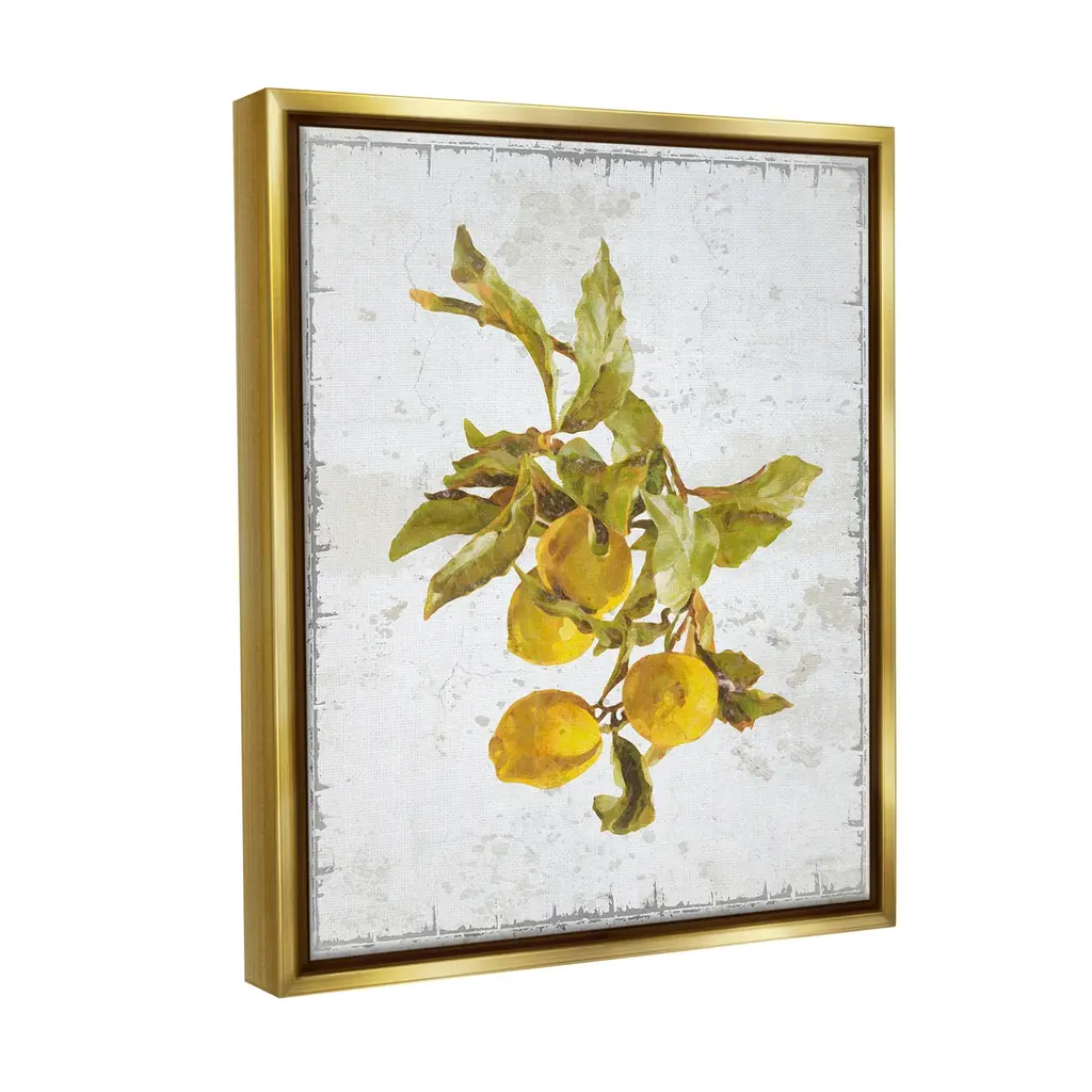 Elevate your home or office to the next level with Stupell Framed Floating Canvas Wall Art. Our premium hand-stretched canvas is mounted securely into a sturdy lightweight frame. The museum-style gap between the wrapped canvas and the box frame gives the illusion of floating artwork. Stupell Wall Art is made in the USA.Features: Dimensions: 17 x 1.7 x 21 Frame, 16 x 1.5 x 20 Canvas ArtFloating Frame Canvas Products are available in sizes 17"x21" and 25"x31". All Floating Frame Canvas Products have a 1.7" Depth.Wall Art is Ready to Hang with Hardware Free Hanging. No Installation required. For Easy Set Up Lean or Layer Artwork on Shelf or Against Wall. Artwork is Permently Fixed into the Frame.Our elevated 1.7" Thick Floating Frame is the perfect complement to our canvas style Wall Art. We use only the highest quality inks in house with industry leading printing solutions. Canvas is hand stretched over a durable wood foundation and then mounted securly into a Modern Box Frame. Made in the USA.Artwork Relates To: Citrus, Fruit, Lemon, Plant, Produce, Rustic, CountryDesign by GraffiTee Studios
