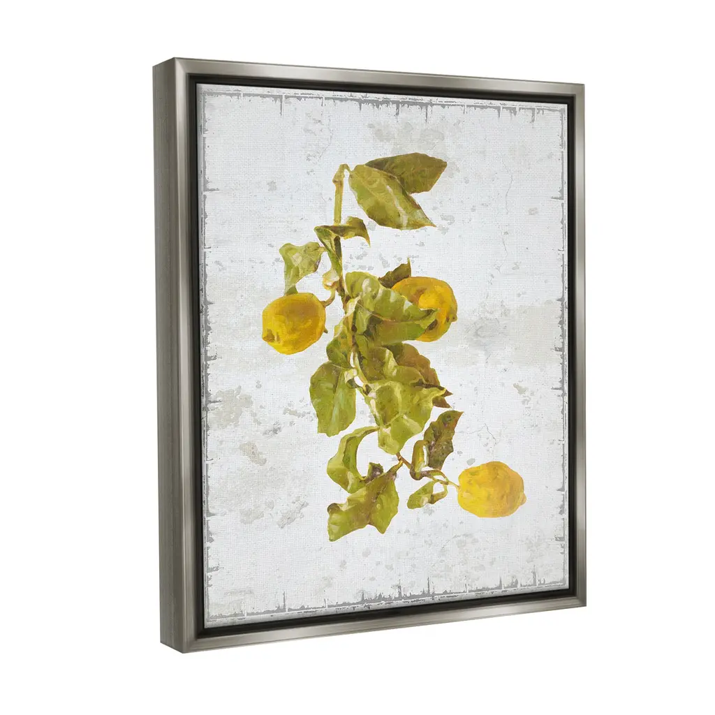 Elevate your home or office to the next level with Stupell Framed Floating Canvas Wall Art. Our premium hand-stretched canvas is mounted securely into a sturdy lightweight frame. The museum-style gap between the wrapped canvas and the box frame gives the illusion of floating artwork. Stupell Wall Art is made in the USA.Features: Dimensions: 17 x 1.7 x 21 Frame, 16 x 1.5 x 20 Canvas ArtFloating Frame Canvas Products are available in sizes 17"x21" and 25"x31". All Floating Frame Canvas Products have a 1.7" Depth.Wall Art is Ready to Hang with Hardware Free Hanging. No Installation required. For Easy Set Up Lean or Layer Artwork on Shelf or Against Wall. Artwork is Permently Fixed into the Frame.Our elevated 1.7" Thick Floating Frame is the perfect complement to our canvas style Wall Art. We use only the highest quality inks in house with industry leading printing solutions. Canvas is hand stretched over a durable wood foundation and then mounted securly into a Modern Box Frame. Made in the USA.Artwork Relates To: Citrus, Fruit, Lemon, Plant, Produce, Rustic, CountryDesign by GraffiTee Studios