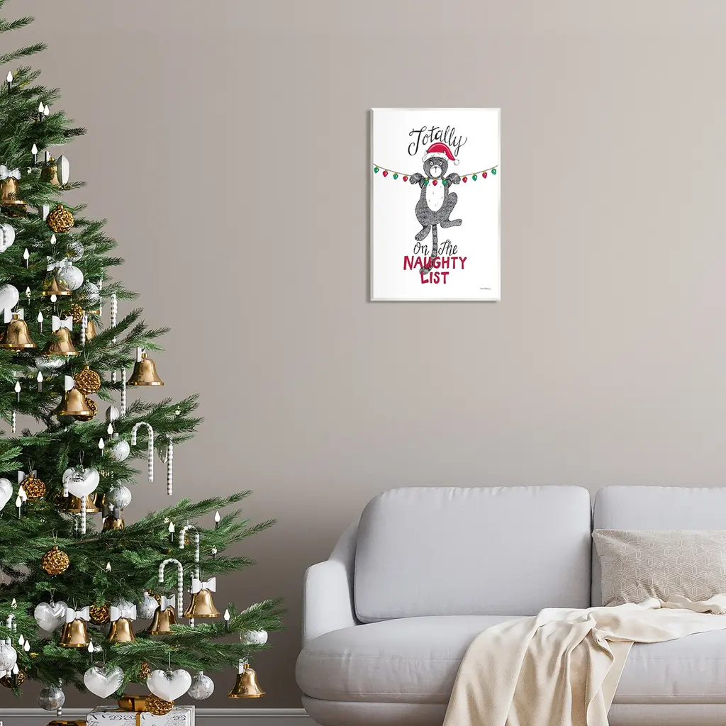 Our wall plaques start as high-quality lithograph prints mounted on durable 0.5-inch thick MDF wood. Each piece is hand finished and comes with a fresh layer of white foil on the sides to give it a crisp, clean look. Plaques arrive ready to hang without installation and come with removable plastic corners to keep them from damage in transit. Stupell Wall Art is made in the USA.Features: Dimensions: 10 x 0.5 x 15 InchesWall Plaque Sizes Include Standard: 10 x 0.5 x 15 Oversized: 13 x 0.5 x 19Wall Art is Ready to Hang with Hardware Free Hanging. No installation required. For Easy Set Up Lean or Layer Artwork on Shelf or Against Wall.All of our wall plaques start off as high quality lithograph prints that are then mounted on durable 0.5 inch thick MDF wood. Each piece is hand finished and comes with a fresh layer of foil on the sides to give it a crisp clean look. Made In USA.Artwork Relates To: Animal, Mammal, Pet, Christmas, Holiday, Seasonal, Funny, Humor, Cat, Totally on the Naughty ListDesign by Deb Strain