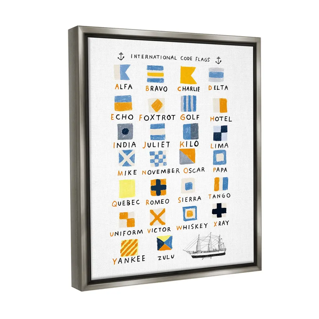 Elevate your home or office to the next level with Stupell Framed Floating Canvas Wall Art. Our premium hand-stretched canvas is mounted securely into a sturdy lightweight frame. The museum-style gap between the wrapped canvas and the box frame gives the illusion of floating artwork. Stupell Wall Art is made in the USA.Features: Dimensions: 17 x 1.7 x 21 Frame, 16 x 1.5 x 20 Canvas ArtFloating Frame Canvas Products are available in sizes 17"x21" and 25"x31". All Floating Frame Canvas Products have a 1.7" Depth.Wall Art is Ready to Hang with Hardware Free Hanging. No Installation required. For Easy Set Up Lean or Layer Artwork on Shelf or Against Wall. Artwork is Permently Fixed into the Frame.Our elevated 1.7" Thick Floating Frame is the perfect complement to our canvas style Wall Art. We use only the highest quality inks in house with industry leading printing solutions. Canvas is hand stretched over a durable wood foundation and then mounted securly into a Modern Box Frame. Made in the USA.Artwork Relates To: Boat, Sailboat, Ship, Flag, Symbol, Educational, Nautical, MaritimeDesign by Hanna Melin