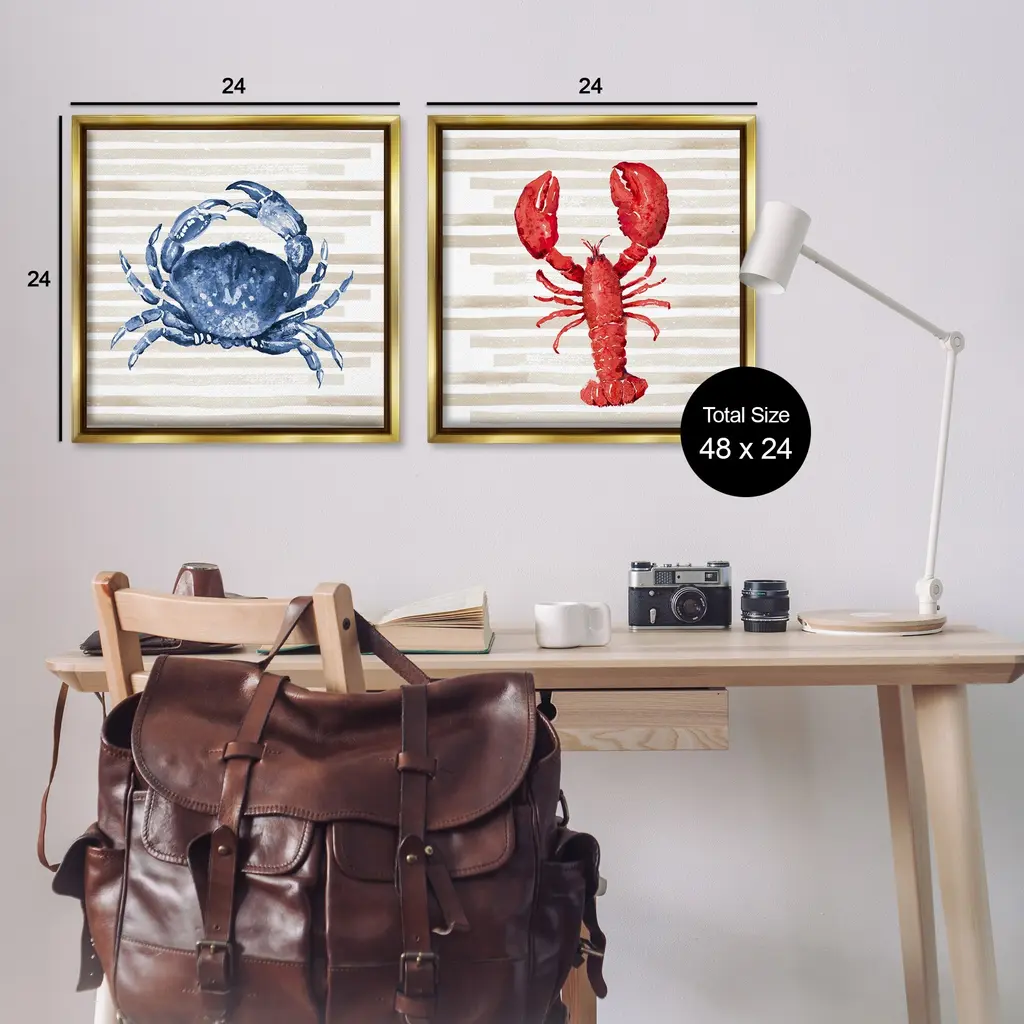 Stupell Nautical Crab & Lobster Beige Stripes Framed Floater Canvas Wall Art Design By Patricia Pinto (Set Of 2) - 25 X 25 - Gold